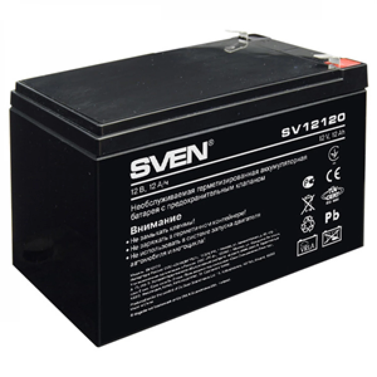 Principalele domenii de utilizare: UPS, iluminație, urgență și sisteme de alarmă de securitate, sursă de curent continuu, sisteme de control automat. Bateria pentru acumulator din seria SVEN SV au următoarele caracteristici: curent slab de auto-descărcare, diapazonul mare al temperaturii de funcționare, eficiență înaltă și calitate a producției. Caracteristici distinctive: - Tip baterie Plumb-acid AGM. - Construcție ermetică. - Nu necesită întreținere și poate funcționa în orice poziție. - Separatoarele dintre electrozi pe baza de fibră de sticlă oferă o durată de viață mai lungă. - Nu emană gaz în timpul funcționării. - Sistemul de valve pentru protecția bateriei împotriva decalajului de tensiune. - Performanță înaltă oferită de rețelele de electrozi din plumb-calciu. - Nivel redus al curentului de auto-descărcare.   Caracteristici tehnice: - Tip baterie: Plumb-Acid tip AGM - Tensiune nominală: 12 V - Curentul maxim de descărcare: 180 A - Capacitate (la 20 ore de descărcare): 12,0 Ah - Curentul maxim de încărcare: 3,6 A - Rezistența internă a 15 milliohms - Temperatura de funcționare nominală: 25 ° C - Temperatura de operare: -20 ° C până la + 50 ° C - Tipul Clemelor: F2 - Dimensiuni (LxАxÎ): 151x98x94 mm - Înălțime totală: 98 mm