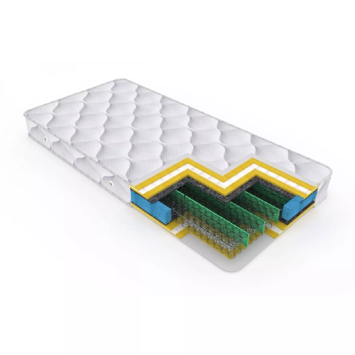 Este confecţionată dintr-o plasă de arcuri bitronice, de tip BONELL, cu 5 inele din sârmă de oţel din carbon, cu grosimea de 2,2 mm, tratate termic la curenţi de înaltă frecvenţă, ceea ce conferă o rezistenţă îndelungată a elasticităţii sârmei. Fiecare rînd de arcuri este legat de următorul printr-o sârma elicoidală, de o grosimea de 1,4 mm, ceea ce conferă rezistenţă la mişcări a saltelei. Rigidizarea perimetrală a saltelei, cu spumă poliuretanică de înaltă densitate SISTEM BOX, nu permite acesteia deformarea sau lasarea în timp. Peste plasa de arcuri (miezul elastic), este pus un strat de suport textil pe ambele feţe, pâslă thermofelt – 1000 gr/m2, apoi un strat de spumă poliuretanică cu densitatea de 21 kg/ m3, cu o grosime de 1 cm, lipită cu adeziv special, ecologic, conform standartelor europene. Materialul exterior este compus din 3 straturi, matlasat complet din Jacquard, împreună cu un strat de vatelină de 200 gr/m2 şi TNT 15 gr/m2. Cantul saltelei este deasemenea întărit de jur imprejur cu bandă decorativă, la fiecare muchie a saltelei, prin coasere dubla la capete. Salteaua este prevăzută cu butoni de aerisire, iar grosimea (înălţimea) este de 20 cm.