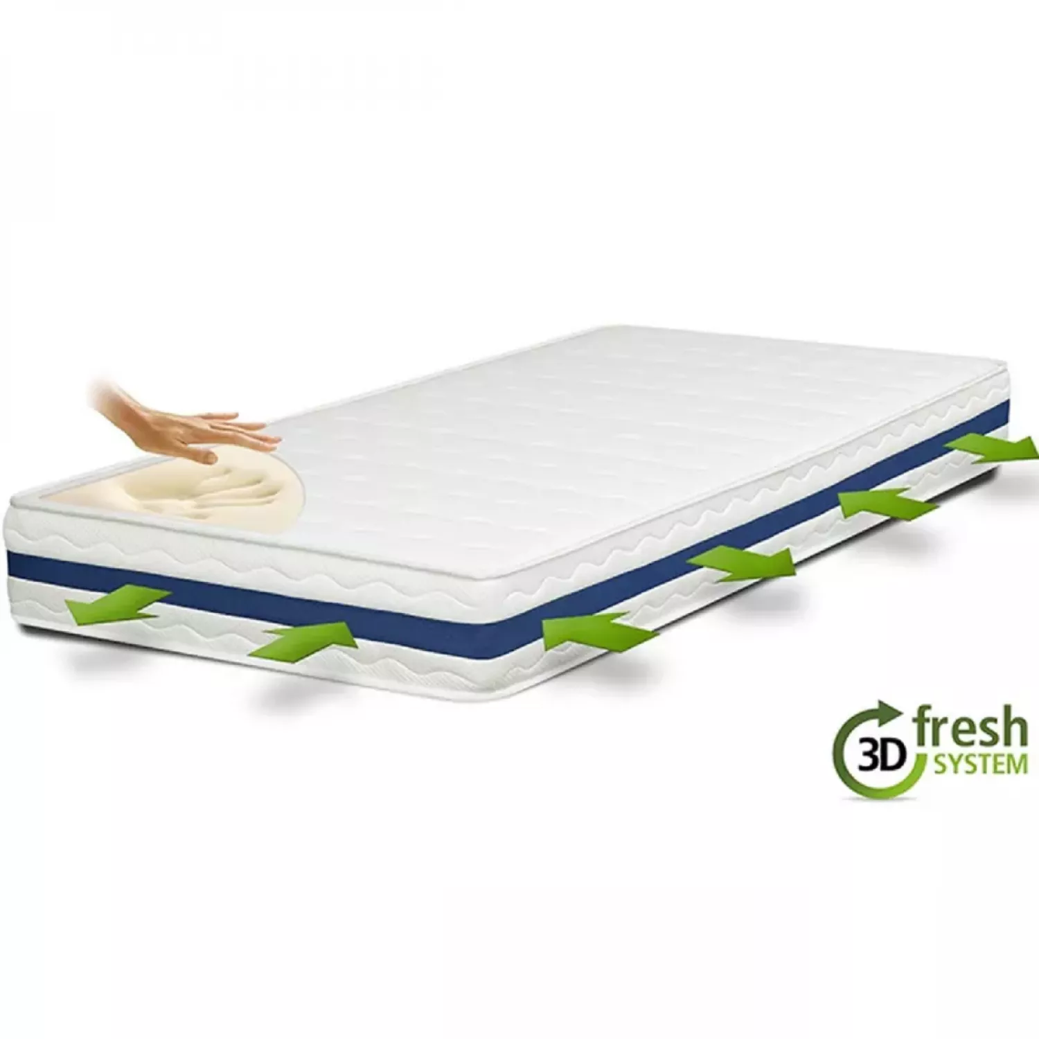 - Peste acest strat este asezată o placa de MemoryFoam cu densitatea de 45 kg/ m3 şi grosimea de 5 cm. Astfel confortul este asigurat de cei 5 cm de MemoryFoam, ce preiau amprenta corpului şi egalizeaza punctele de presiune, susţinând în mod natural coloana vertebrală. Spuma vascoelastică fiind un material ce răspunde nu numai greutăţii corpului ci şi căldurii emise de acesta, fiind şi termoreglabil, totodata, va putea "amprenta" foarte eficient forma corpului, indiferent daca aveţi obiceiul sa dormiţi pe burtă, spate sau pe lateral.