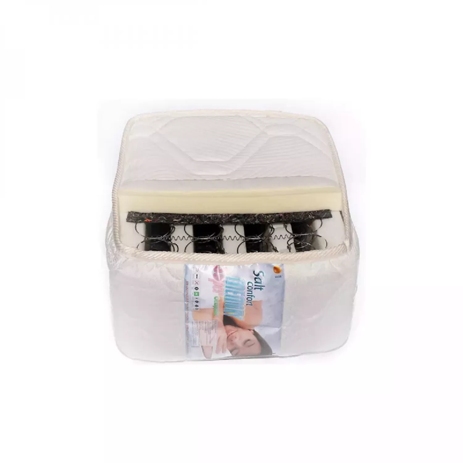 - Materialul exterior este realizat din 3 straturi, triplu matlasat, complet din bumbac, peste care se inserează un strat de vatelină cu densitatea de 200 g/m şi TNT 12 g/m2. Între rândurile de arcuri sunt montate benzi din spumă poliuretanică pentru a atenua efectul de val (transniterea mişcărilor în corpul saltelei) şi pentru a reduce indicele de elasticitate.