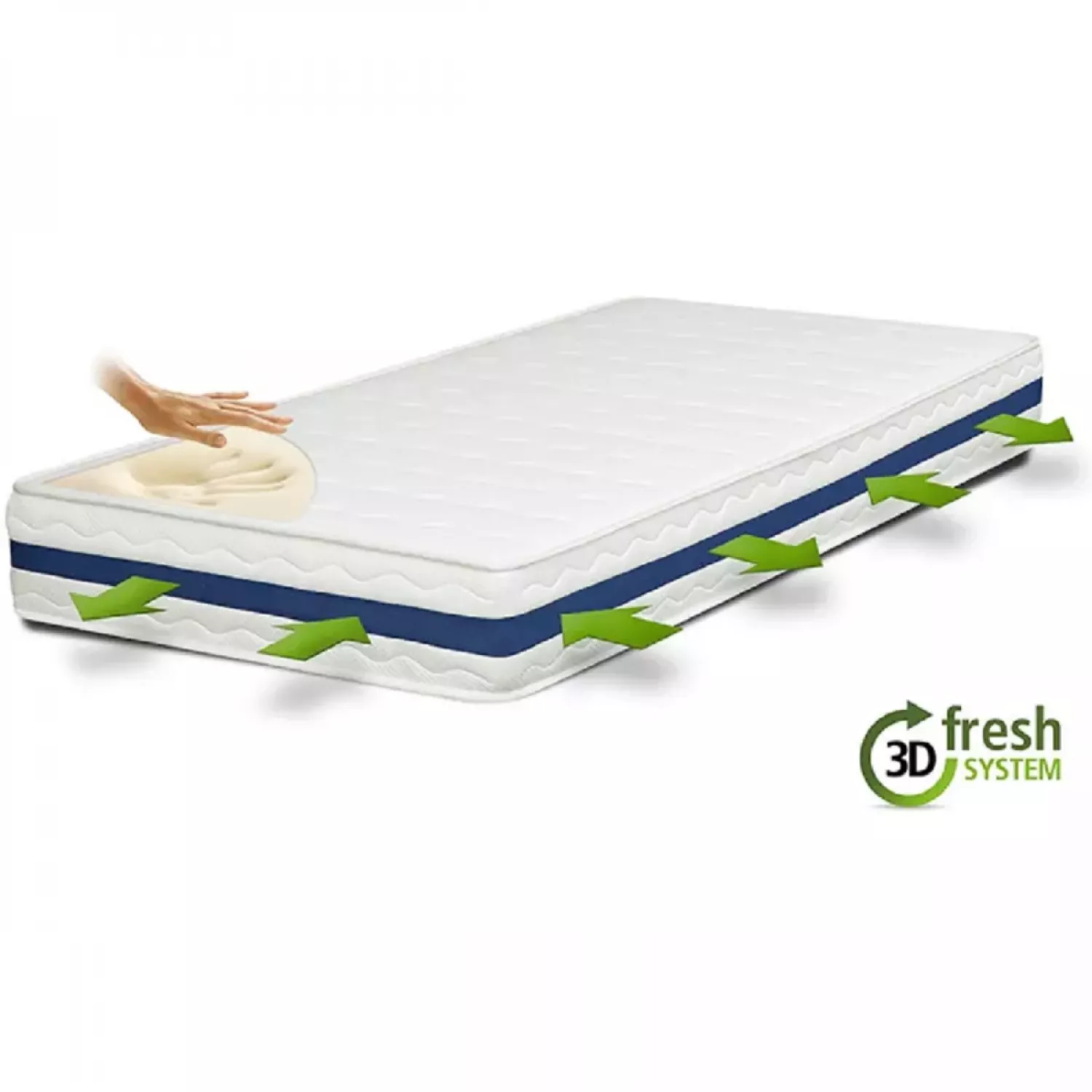 - Peste acest strat este asezată o placa de MemoryFoam cu densitatea de 45 kg/ m3 şi grosimea de 5 cm. Astfel confortul este asigurat de cei 5 cm de MemoryFoam, ce preiau amprenta corpului şi egalizeaza punctele de presiune, susţinând în mod natural coloana vertebrală. Spuma vascoelastică fiind un material ce răspunde nu numai greutăţii corpului ci şi căldurii emise de acesta, fiind şi termoreglabil, totodata, va putea "amprenta" foarte eficient forma corpului, indiferent daca aveţi obiceiul sa dormiţi pe burtă, spate sau pe lateral.