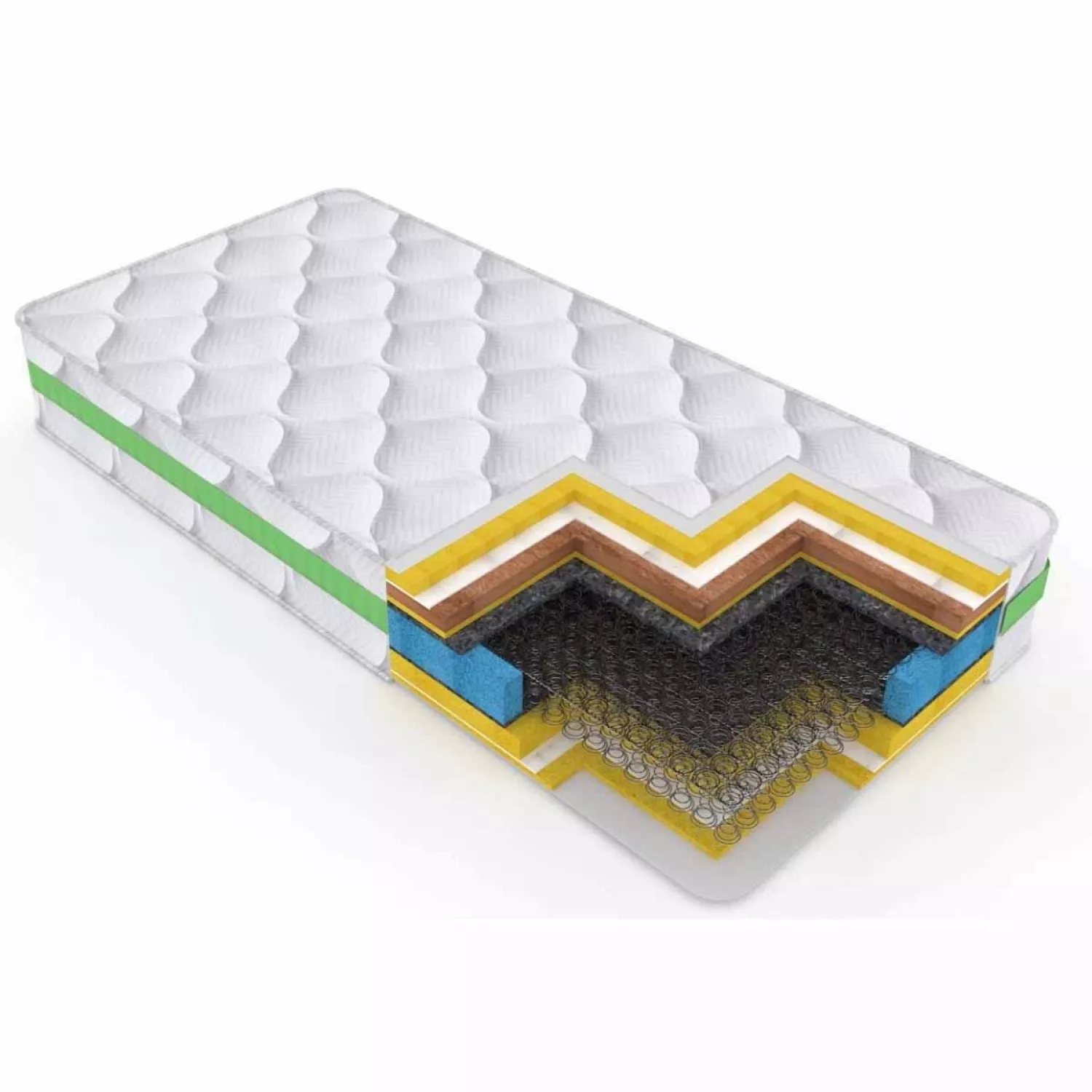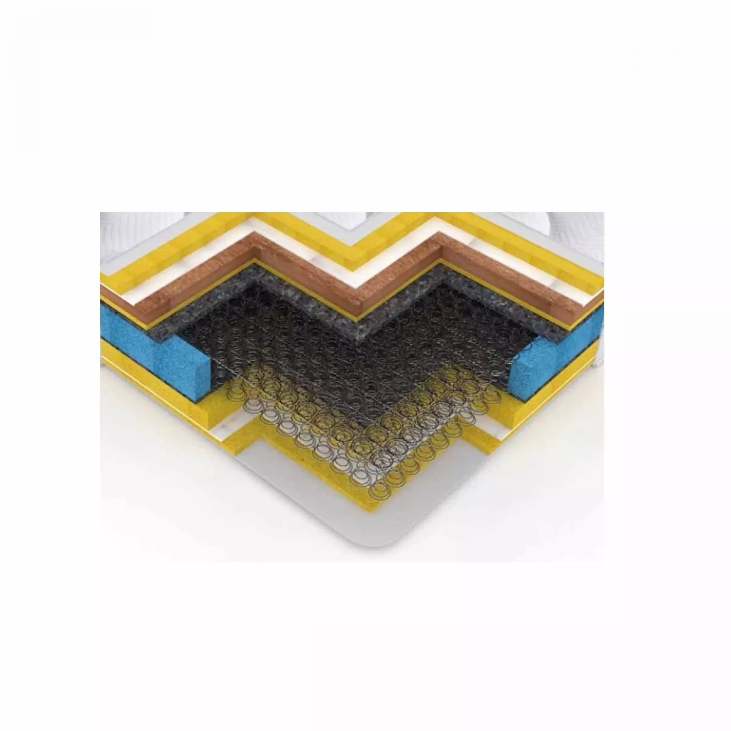 - Peste acest strat este aşezată o placă din fibre de cocos cu densitatea de 130 kg/ m3 şi grosimea de 10 mm. Fibrele de cocos sortate sunt presate și acoperite de lapte de latex fierbinte. Astfel rezultă un material foarte elastic și dur, și în același timp foarte rezistent.Materialul exterior este compus din 4 straturi, matlasat complet din Bumbac 80% si Polyester 20%, împreuna cu un strat de vatelină de 150g/ m2, si un strat de spuma poliuretanica cu densitate de 18kg/ m3, cu grosime de 10 mm si TNT 15g/ m2.