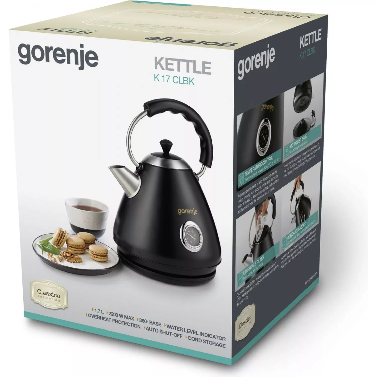 Caracteristici pentru Ceainic electric GORENJE K17CLBK, 1.7 l, 2200 W, Plastic, Metal, Filtru, baza rotativa, indicator lucru, Negru