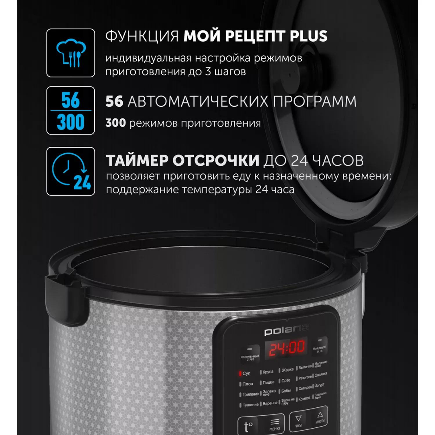 Caracteristici pentru Multifierbator POLARIS PMC0578AD, 5 l, 750 W, 56 programe, Reteta mea Plus, supa, cereale, prajire, coacere, terci de lapte, pilaf, pizza, Inox, Negr