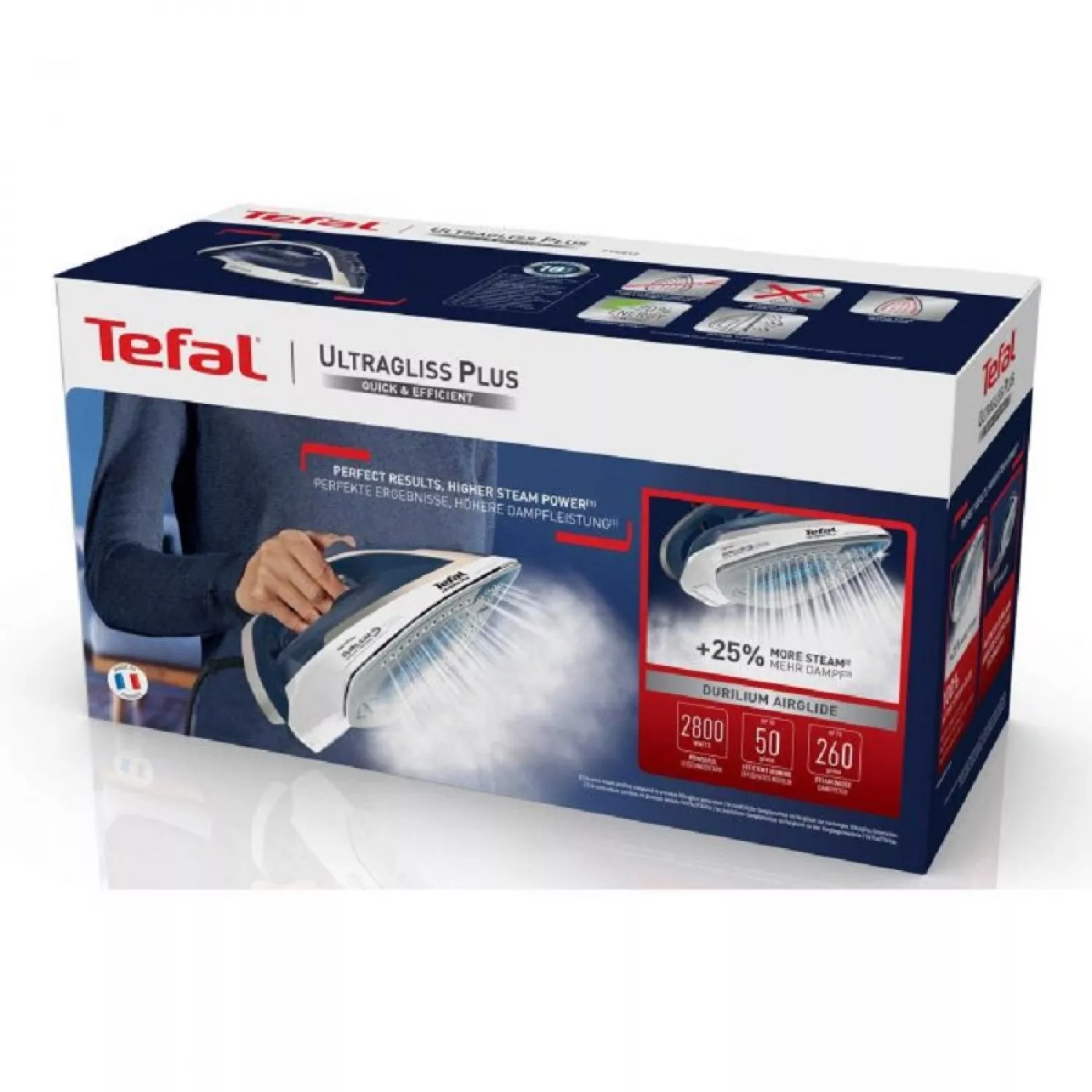 Caracteristici pentru Fier de calcat Tefal FV6812E0, Talpa Durilium Airglide, 2800 W, Jet de aburi 260 g, min, 270 ml, Albastru, Alb