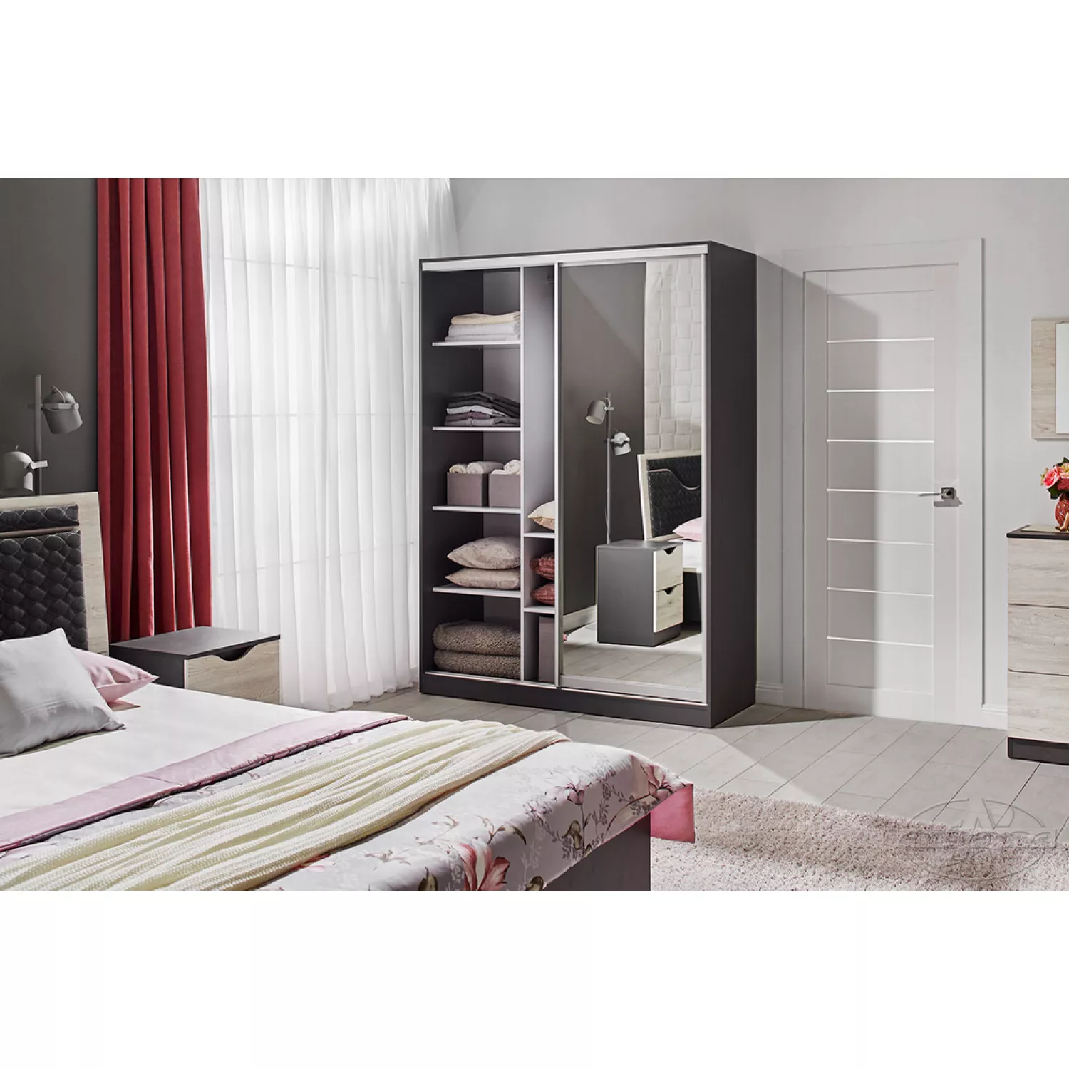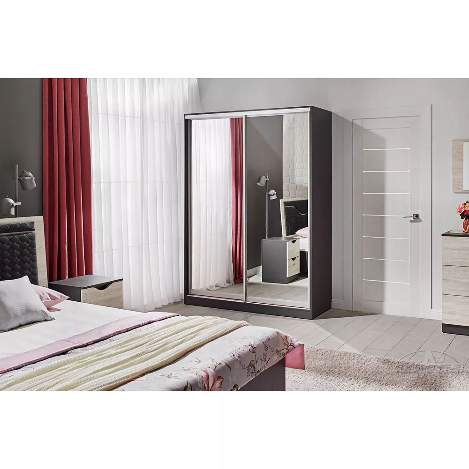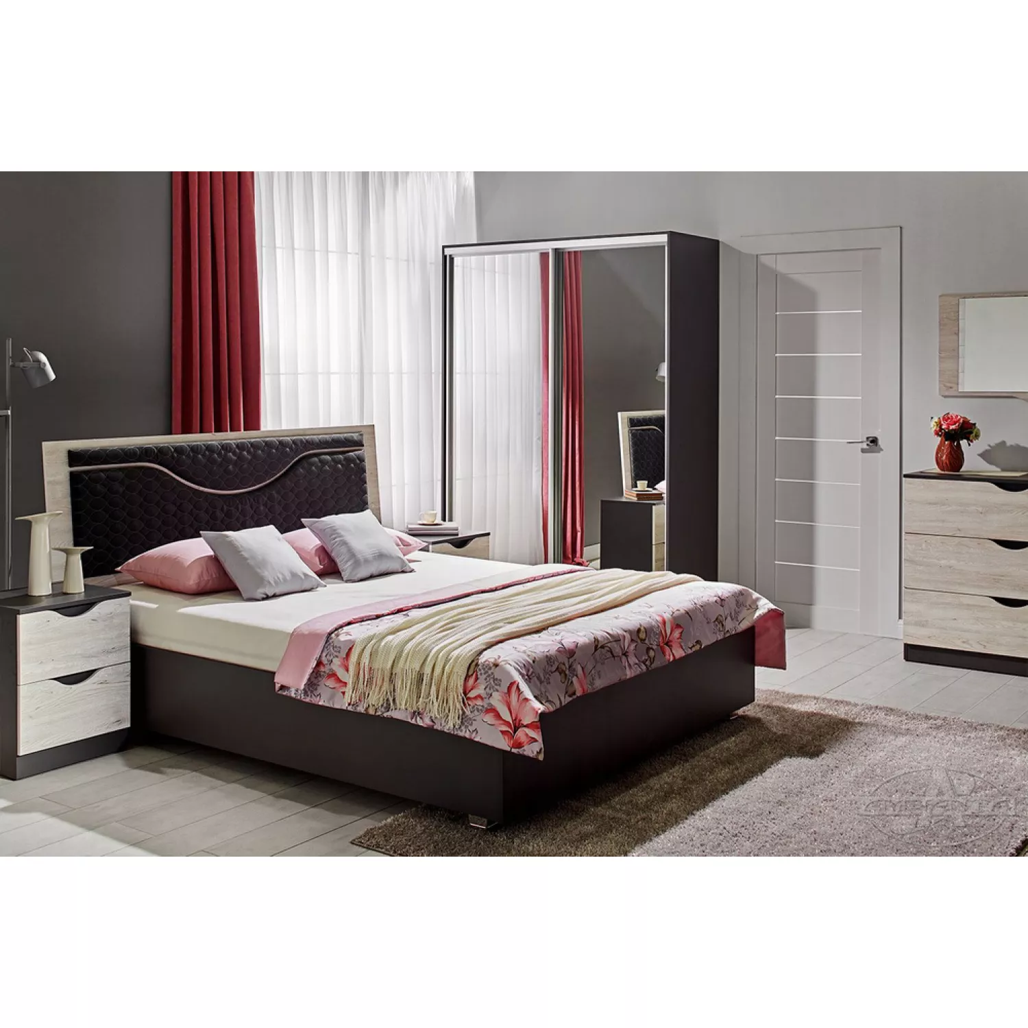 | Pat (160 cm), сomoda, dulap cu usi culisante, oglinda, 2 noptiere |