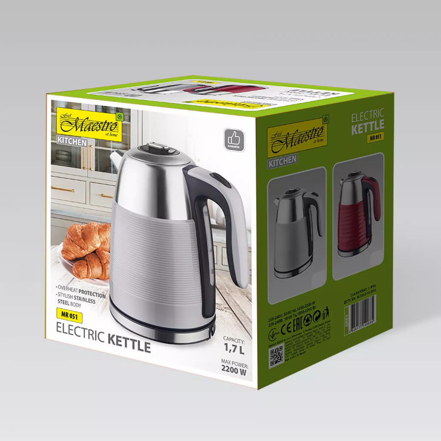 Caracteristici pentru Ceainic electric Maestro MR -051, 1.7 l, 2200 W, Inox, Plastic, Filtru, Baza rotativa, Indicator nivel apa, Inox, Gri
