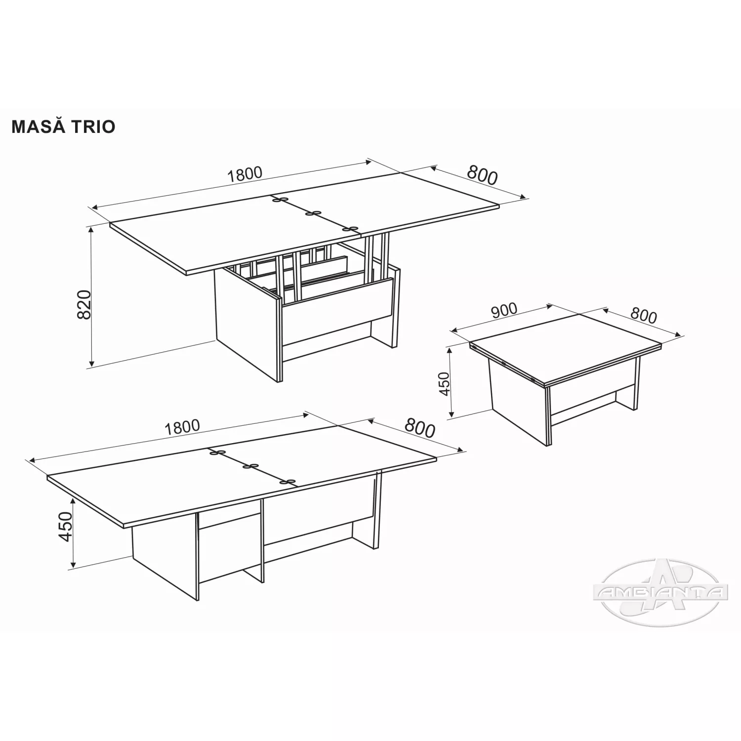 Caracteristici pentru Masa Ambianta TRIO, PAL melaminat, Sonoma inchis, 90-180 x 80 x 45-82 cm