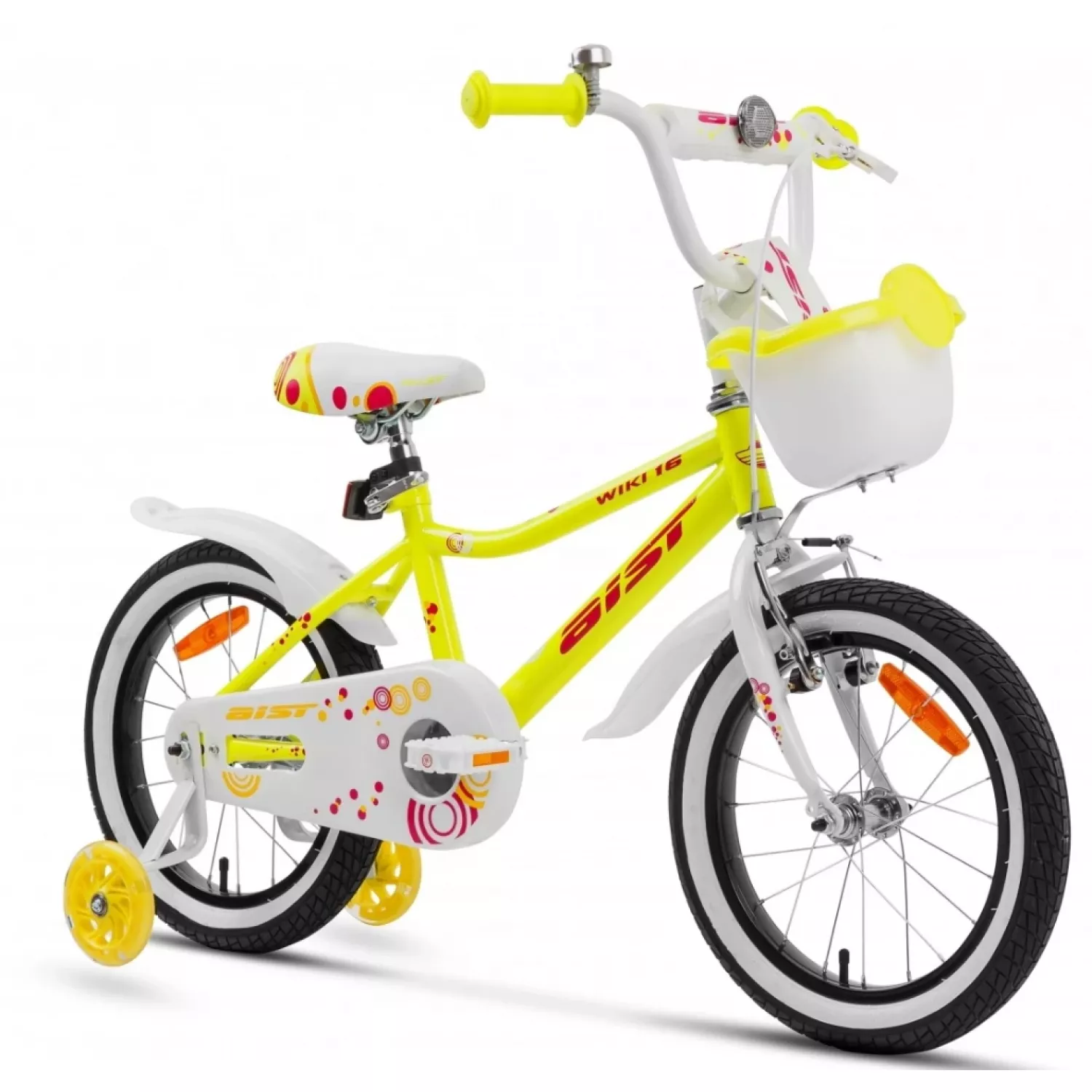 WIKI 16" (ДЕВОЧКА) ЖЕЛТЫЙ С БЕЛЫМ 16 СТАЛЬ 1 V-BRAKE НОЖНОЙ ПЛАСТ. КРЫЛЬЯ, ЗВОНОК, БОКОВЫЕ КОЛЕСА, КОРЗИНА |