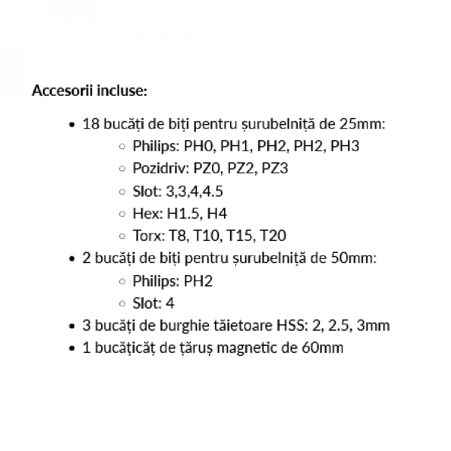 18 bucăți de biți pentru șurubelniță de 25mm, 2 bucăți de biți pentru șurubelniță de 50 mm, 3 bucăți de burghie tăietoare HSS, țăruș magnetic de 60 mm