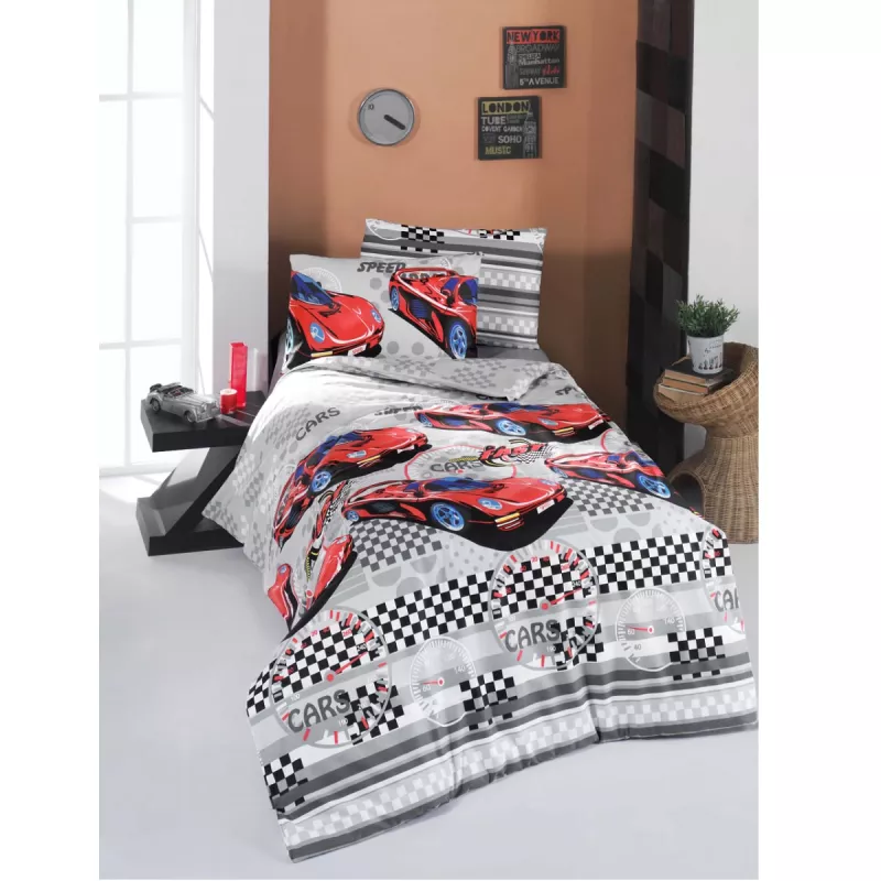 Lenjerie de pat Cottony SLPP CARS, DAMIAN F53, 2 persoane Euro, Poplin, Alb, Gri