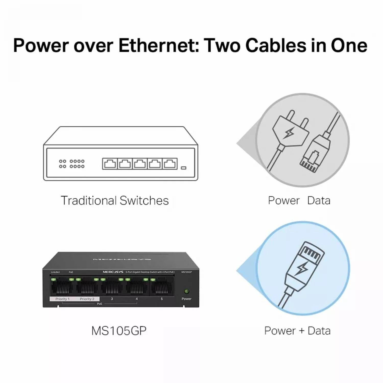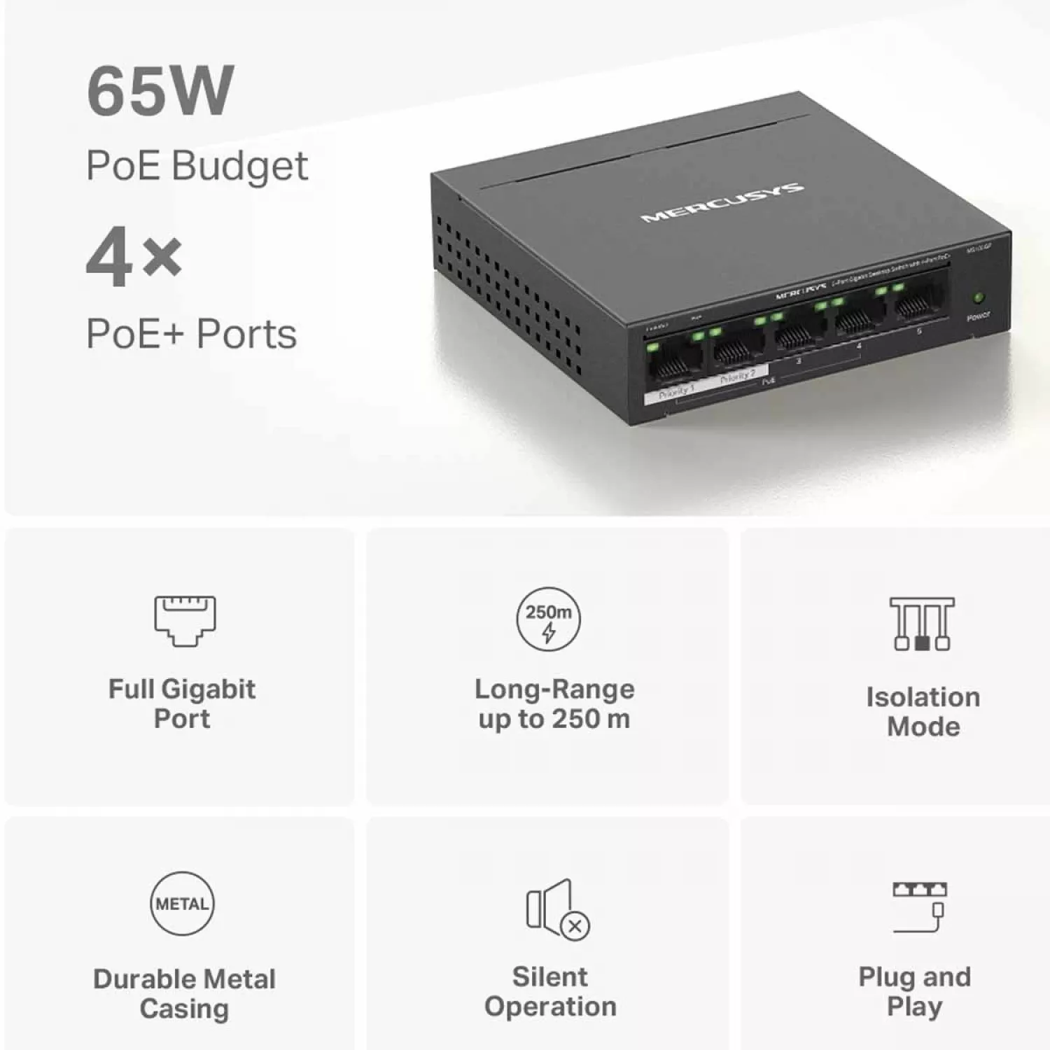 Caracteristici pentru Comutator de retea MERCUSYS .5-PORT GIGABIT SWITCH "MS105GP", WITH 4-PORT POE, STEEL CASE, 65W BUDGET