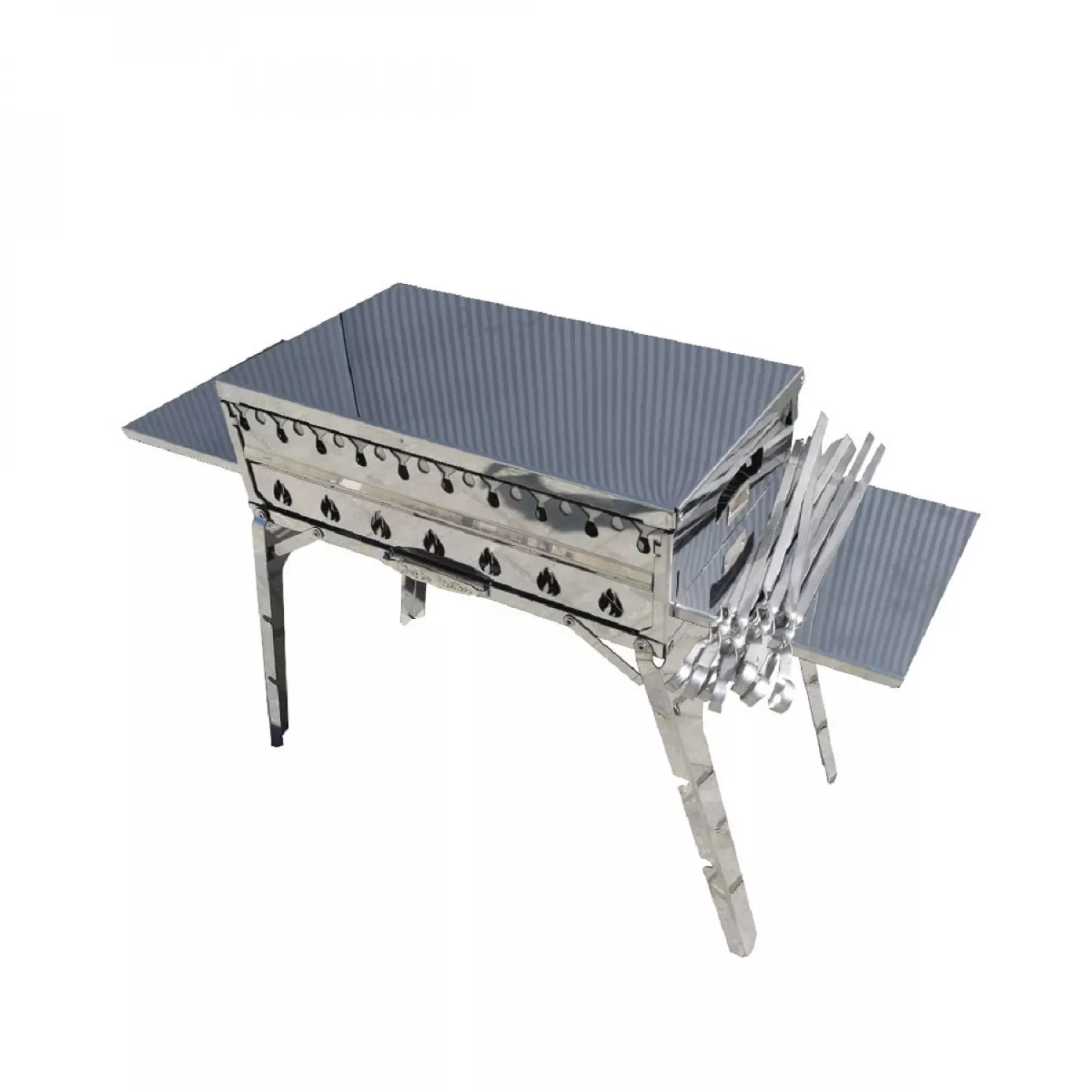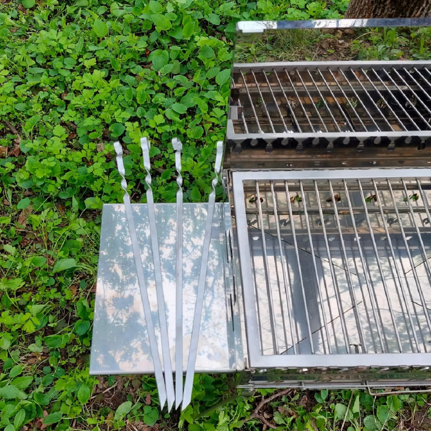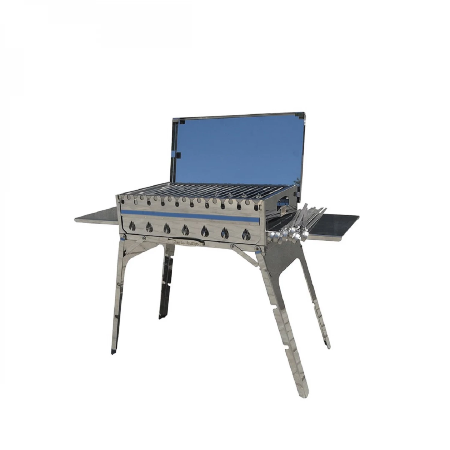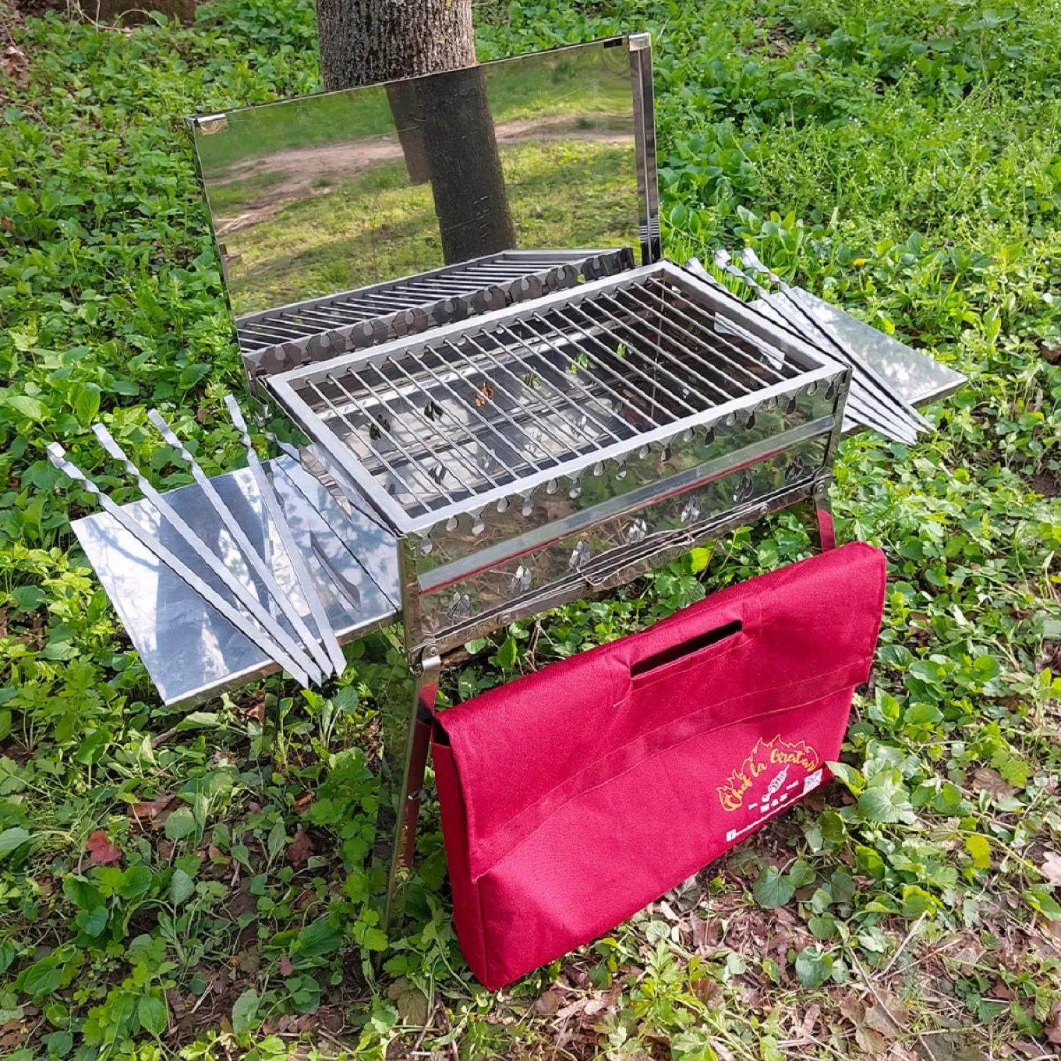 În set este inclus: grătarul pliabil, 2 polițe laterale, set din 9 șampuri din inox, plasa din inox, capacul și geanta în care încap compact toate acces