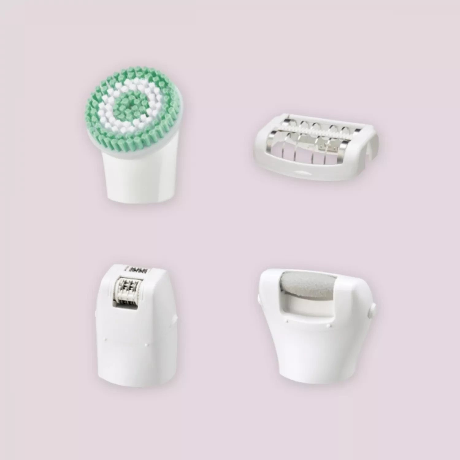 | Set de 7 piese (Cap de epilare pentru picioare și brațe, Cap mic de epilare, Cap de epilare delicat, Cap de exfoliere adâncă, Cap pentru picioare, Cutie de depozitare, Perie de curățare) |