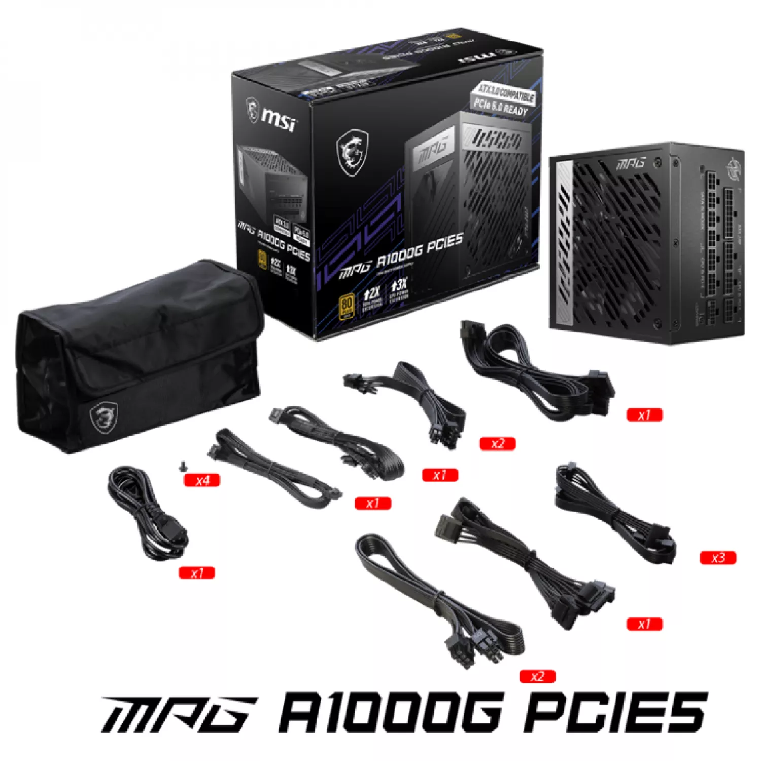 Sursa de alimentare pc msi "mpg a1000g pcie5", 1000w, atx12v v3.0, 80 plus® gold, full modular, flat black cables, active pfc + half bridge src llc+dc to dc, 135mm fdb fan with pwm, 0%prm mode, +12v(83.5a), 20+4 pin, 2xcpu(4+4pin), 12x sata, 6xpci-e(6+2pin), 4x peripheral, 1xpci-e 16pin, ocp/otp/ovp/opp/uvp/scp, black