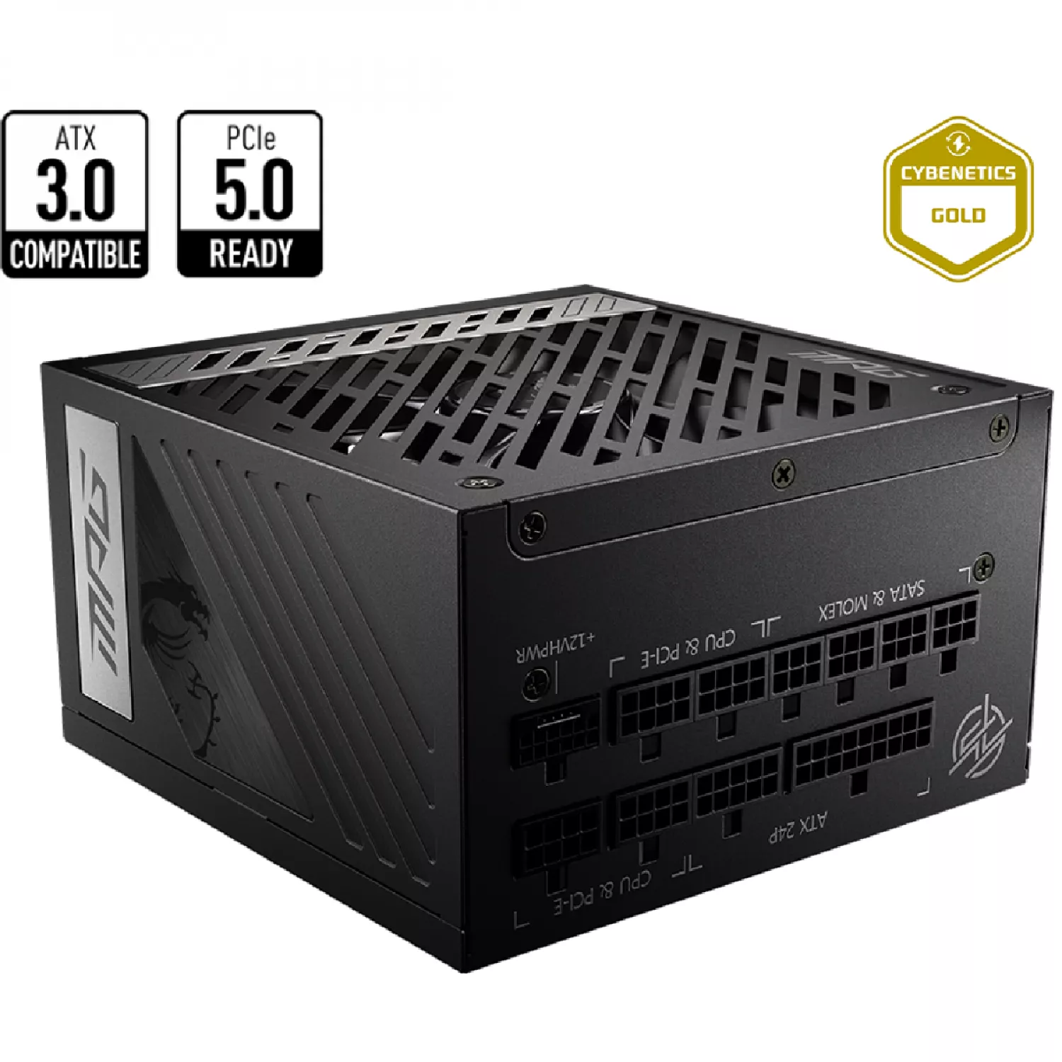 Caracteristici pentru Sursa de alimentare PC MSI "MPG A1000G PCIE5", 1000W, ATX12V V3.0, 80 PLUS® Gold, Full Modular, Flat Black Cables, Active PFC + Half Bridge SRC LLC+DC to DC, 135mm FDB Fan with PWM, 0%PRM Mode, +12V(83.5A), 20+4 Pin, 2xCPU(4+4Pin), 12x SATA, 6xPCI-E(6+2pin), 4x Peripheral, 1xPCI-E 16pin, OCP/OTP/OVP/OPP/UVP/SCP, Black