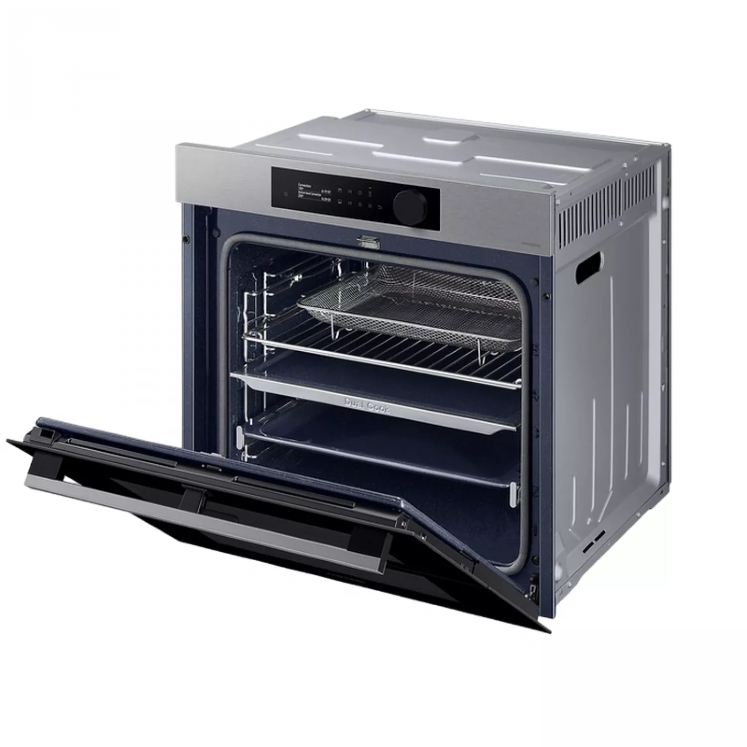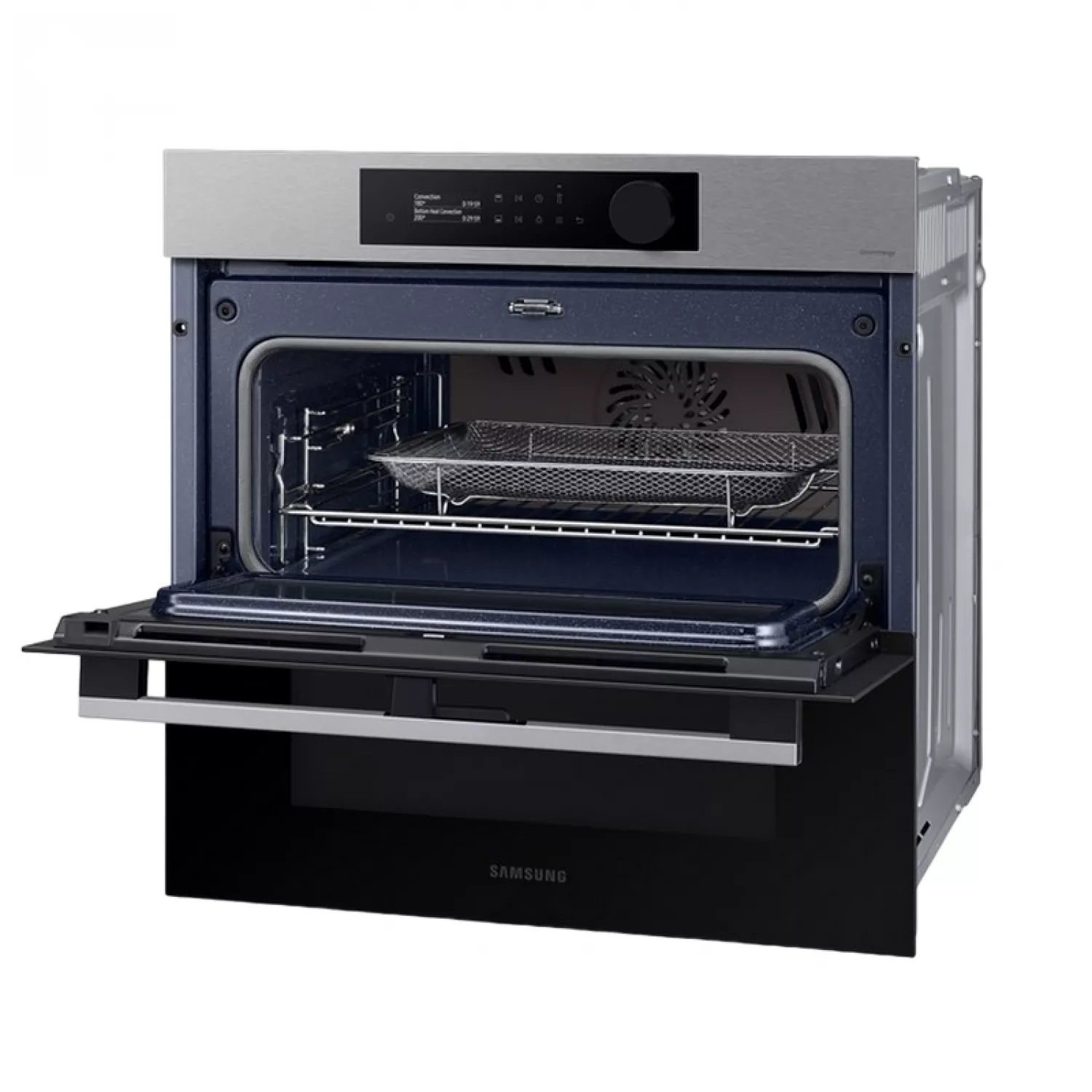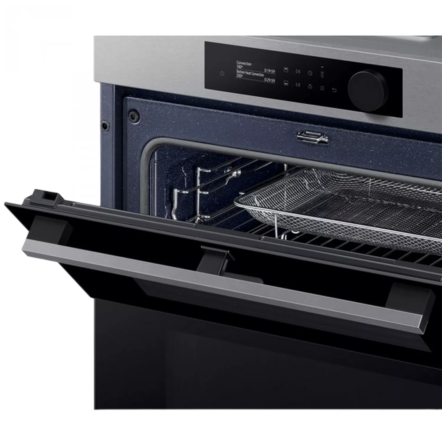 Gătiți o varietate de preparate mai flexibil și mai eficient. Zonele superioare și inferioare ale Dual Cook Flex funcționează independent. Folosiți doar zona superioară pentru preparate mai mici, cu setări variabile de temperatură și timp, sau întregul cuptor pentru preparate mai mari. Ușa cu balamale permite accesul facil la zona superioară. Bucurați-vă de alimente delicioase, suculente, dar crocante. Pentru a utiliza Natural Steam*, pur și simplu așezați tava specială de copt pe fundul cuptorului și turnați apă peste ea. Aceasta creează abur în timp ce gătiți. Acest lucru ajută la păstrarea umidității naturale a alimentelor, asigurându-le că sunt suculente și fragede la interior și rumenite și crocante la exterior. Bucurați-vă de gătit simplu cu comenzi intuitive și personalizate. Designul elegant prezintă un panou de control elegant, cu un afișaj LCD de 2,25 inci și un singur buton. În funcție de modelele de utilizare, acesta afișează setările cele mai frecvent utilizate pentru o selecție rapidă. Bucurați-vă de alimente prăjite sănătoase fără o friteuză. Air Fry combină o tavă specială cu aer cald circulant care învelește alimentele. Este modalitatea perfectă de a găti cartofi prăjiți, cartofi prăjiți Tater Tots sau chiar legume, deoarece îndepărtează excesul de grăsime, lăsând totul crocant și rumenit la exterior și suculent la interior. Gătiți alimentele mai uniform, prevenind supragătirea sau uscarea. Sistemul Air Sous Vide* măsoară cu precizie temperatura din fiecare cavitate și menține o temperatură constantă pe o perioadă lungă de timp. Acest lucru asigură că totul este gătit complet, oriunde s-ar afla în cuptor, și are un gust delicios de fraged și suculent. Gătiți cu plăcere! SmartThings Cooking* economisește timp și simplifică gătitul. Aplicația recomandă rețete în funcție de preferințele dvs. și creează meniuri săptămânale. Păstrați interiorul cuptorului curat și ordonat fără a pierde timp și efort cu frecarea sau utilizarea de produse de curățare scumpe. Sistemul de curățare pirolitică* încălzește cavitatea pentru a arde grăsimea și reziduurile alimentare rămase după gătire. Totul rămâne impecabil, tot ce trebuie să faceți este să ștergeți cenușa. Nu pierdeți timp și efort curățând cuptorul. Sistemul de curățare catalitică* face ca menținerea curățeniei cuptorului să fie o joacă de copii. Panourile catalitice din spatele cavității cuptorului absorb grăsimea de la stropi și picături în timpul gătirii. Aceasta înseamnă că cuptorul se curăță singur, eliminând manopera și produsele de curățare costisitoare.