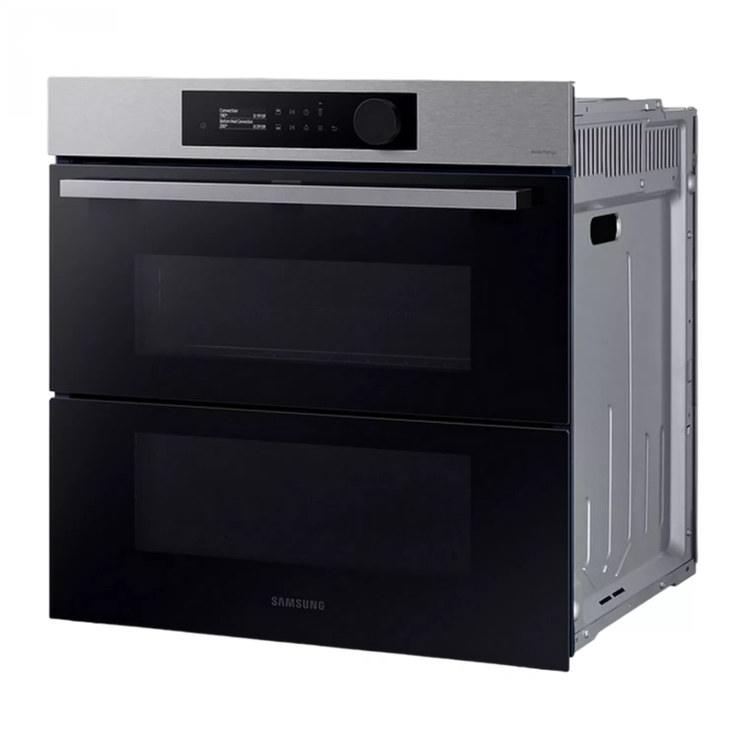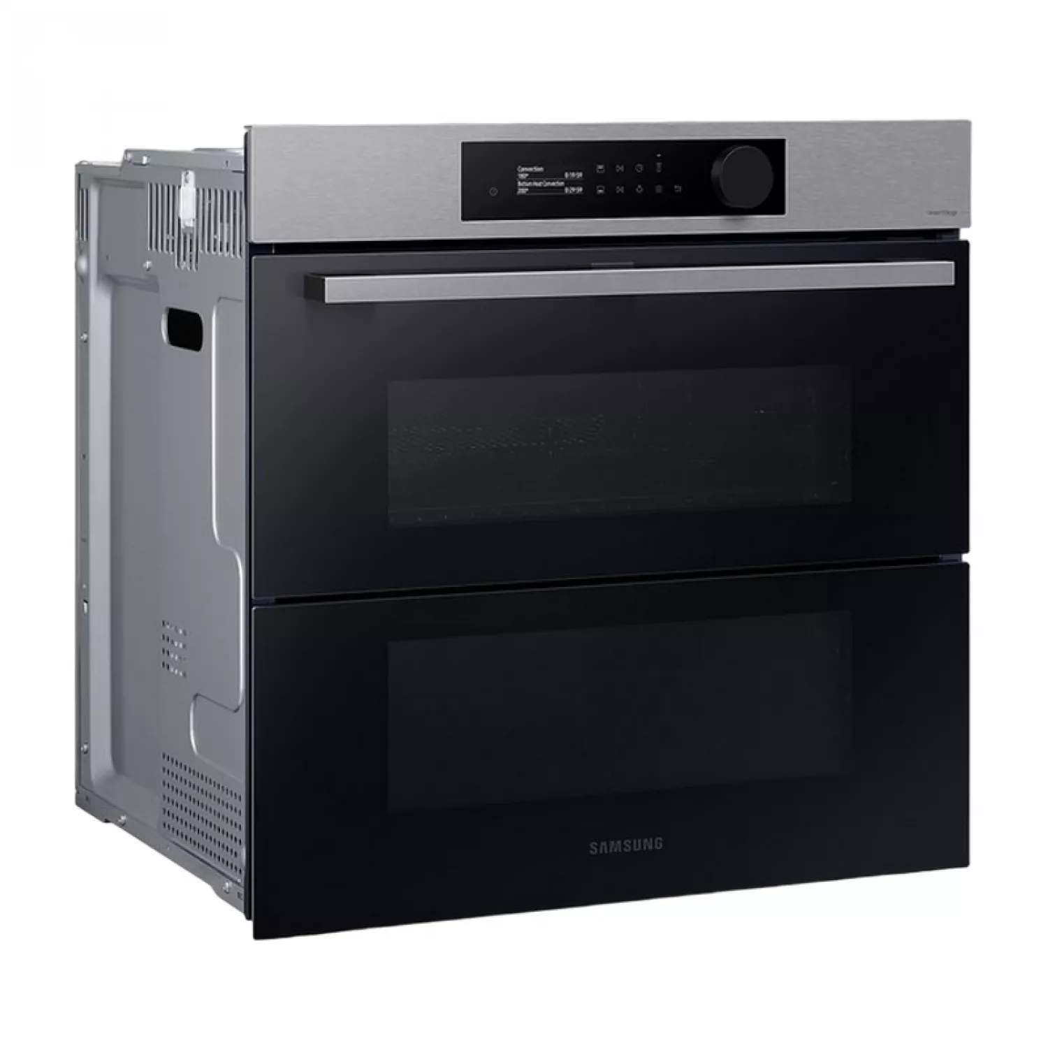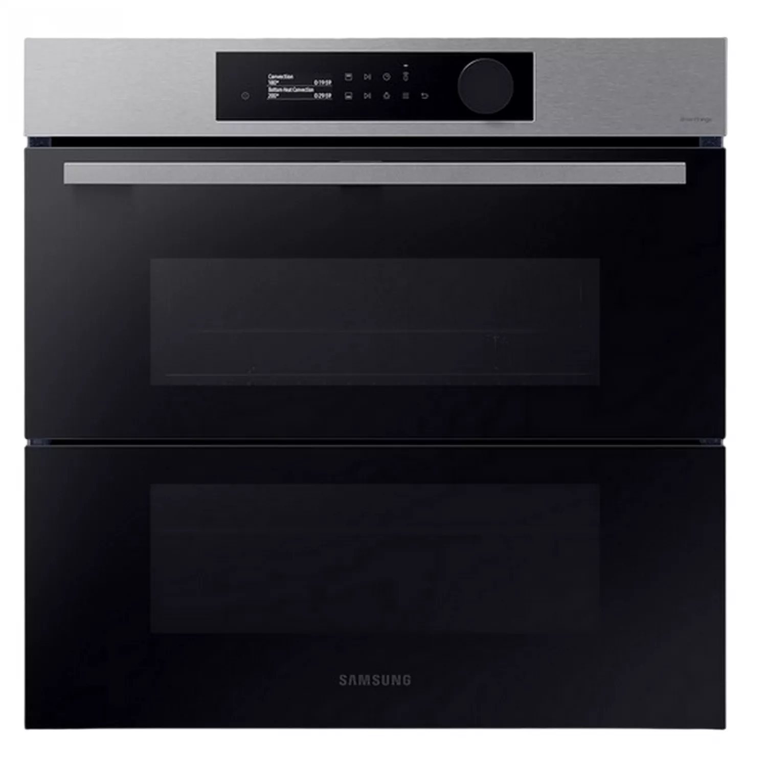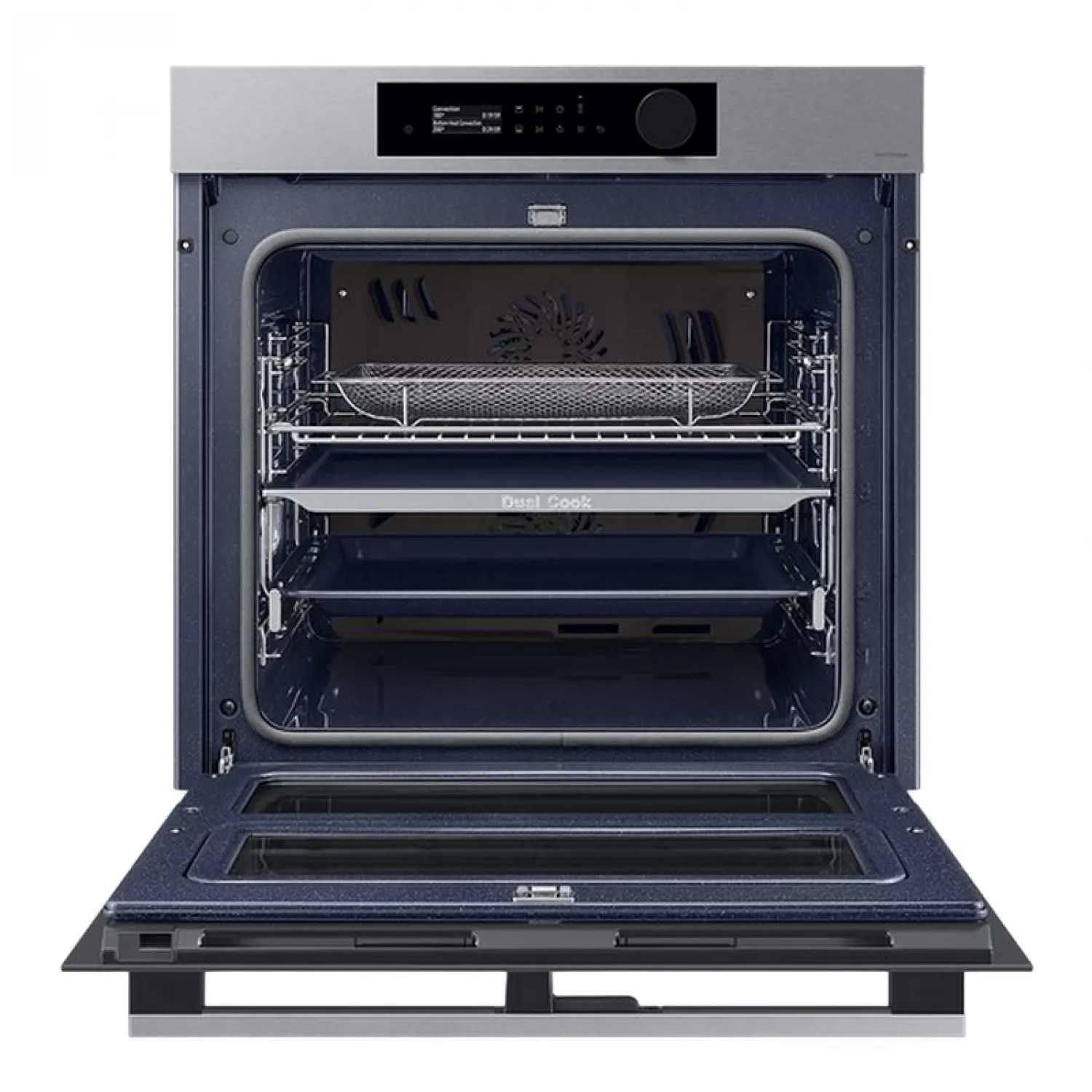 Gătiți o varietate de preparate mai flexibil și mai eficient. Zonele superioare și inferioare ale Dual Cook Flex funcționează independent. Folosiți doar zona superioară pentru preparate mai mici, cu setări variabile de temperatură și timp, sau întregul cuptor pentru preparate mai mari. Ușa cu balamale permite accesul facil la zona superioară. Bucurați-vă de alimente delicioase, suculente, dar crocante. Pentru a utiliza Natural Steam*, pur și simplu așezați tava specială de copt pe fundul cuptorului și turnați apă peste ea. Aceasta creează abur în timp ce gătiți. Acest lucru ajută la păstrarea umidității naturale a alimentelor, asigurându-le că sunt suculente și fragede la interior și rumenite și crocante la exterior. Bucurați-vă de gătit simplu cu comenzi intuitive și personalizate. Designul elegant prezintă un panou de control elegant, cu un afișaj LCD de 2,25 inci și un singur buton. În funcție de modelele de utilizare, acesta afișează setările cele mai frecvent utilizate pentru o selecție rapidă. Bucurați-vă de alimente prăjite sănătoase fără o friteuză. Air Fry combină o tavă specială cu aer cald circulant care învelește alimentele. Este modalitatea perfectă de a găti cartofi prăjiți, cartofi prăjiți Tater Tots sau chiar legume, deoarece îndepărtează excesul de grăsime, lăsând totul crocant și rumenit la exterior și suculent la interior. Gătiți alimentele mai uniform, prevenind supragătirea sau uscarea. Sistemul Air Sous Vide* măsoară cu precizie temperatura din fiecare cavitate și menține o temperatură constantă pe o perioadă lungă de timp. Acest lucru asigură că totul este gătit complet, oriunde s-ar afla în cuptor, și are un gust delicios de fraged și suculent. Gătiți cu plăcere! SmartThings Cooking* economisește timp și simplifică gătitul. Aplicația recomandă rețete în funcție de preferințele dvs. și creează meniuri săptămânale. Păstrați interiorul cuptorului curat și ordonat fără a pierde timp și efort cu frecarea sau utilizarea de produse de curățare scumpe. Sistemul de curățare pirolitică* încălzește cavitatea pentru a arde grăsimea și reziduurile alimentare rămase după gătire. Totul rămâne impecabil, tot ce trebuie să faceți este să ștergeți cenușa. Nu pierdeți timp și efort curățând cuptorul. Sistemul de curățare catalitică* face ca menținerea curățeniei cuptorului să fie o joacă de copii. Panourile catalitice din spatele cavității cuptorului absorb grăsimea de la stropi și picături în timpul gătirii. Aceasta înseamnă că cuptorul se curăță singur, eliminând manopera și produsele de curățare costisitoare.