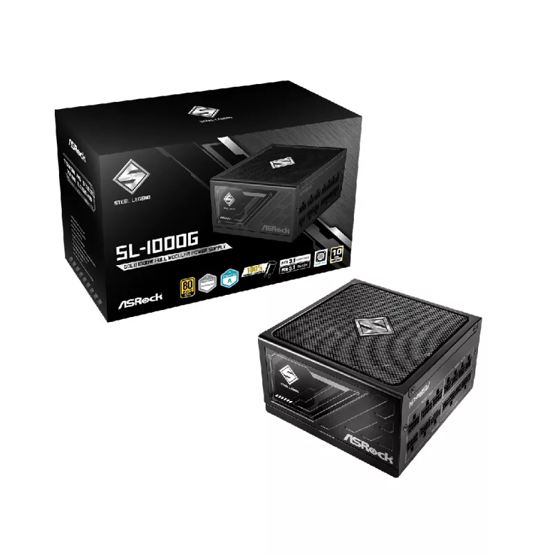 ASRock Steel Legend "SL-1000G", 1000W, ATX3.1 and PCIe5.1 Ready, 80 PLUS® GOLD, Fully Modular Cable Design, 135mm Striped Axial FDB Fan, iCool Intelligent Fan Control Mode, Built-in 5V BOOST function, 100% Highly Reliable Japanese Capacitors, +12V (8 |