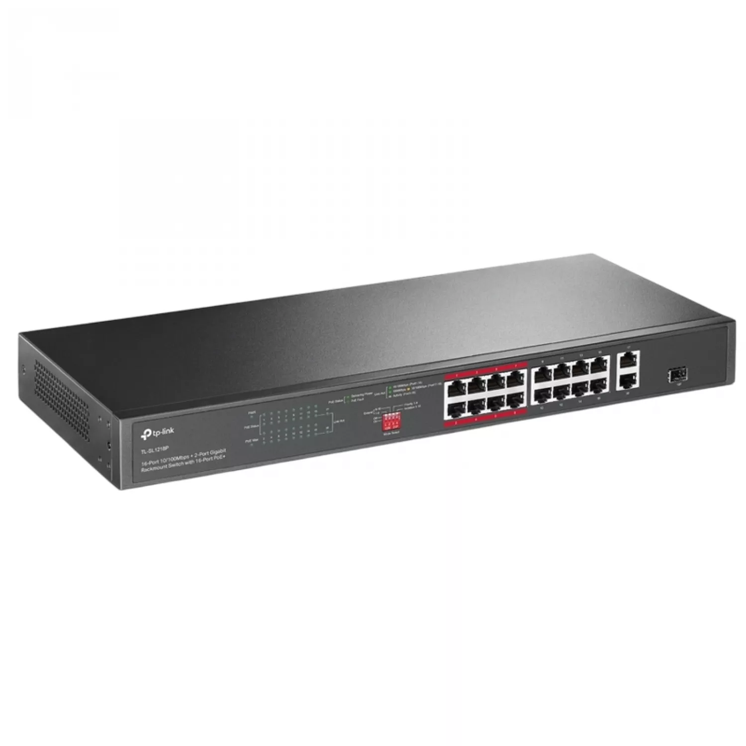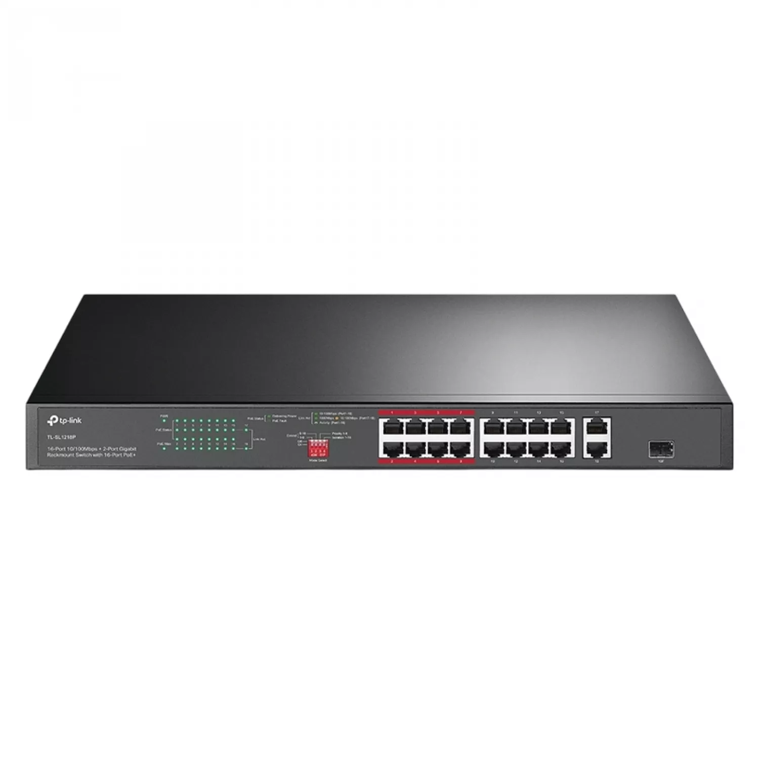 16-PORT 10/100M POE+ SWITCH, TL-SL1218P V5, 2XGBIT, 1XSFP COMBO, 150W BUDGET, AUTO RECOVERY, 1U 19", STEEL |