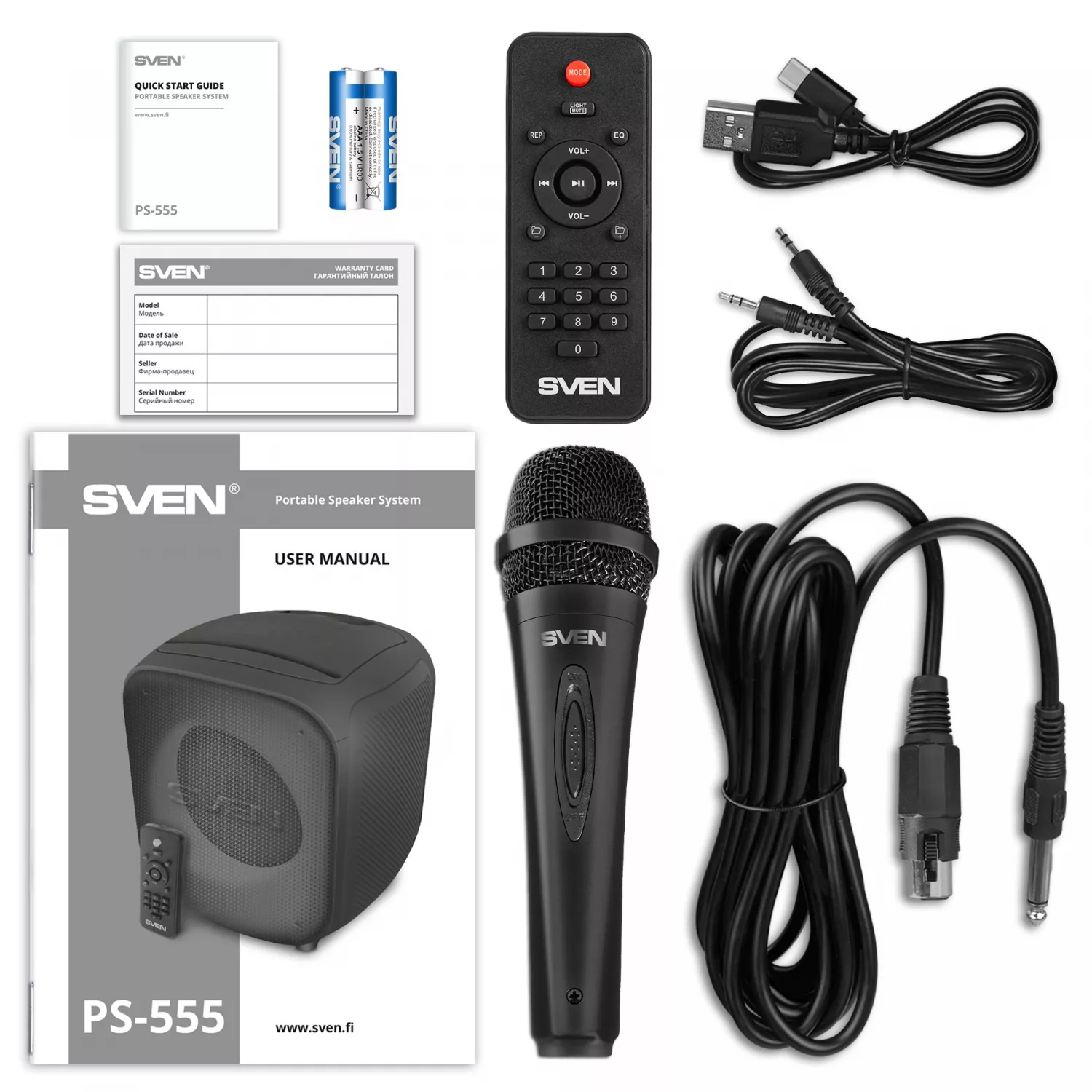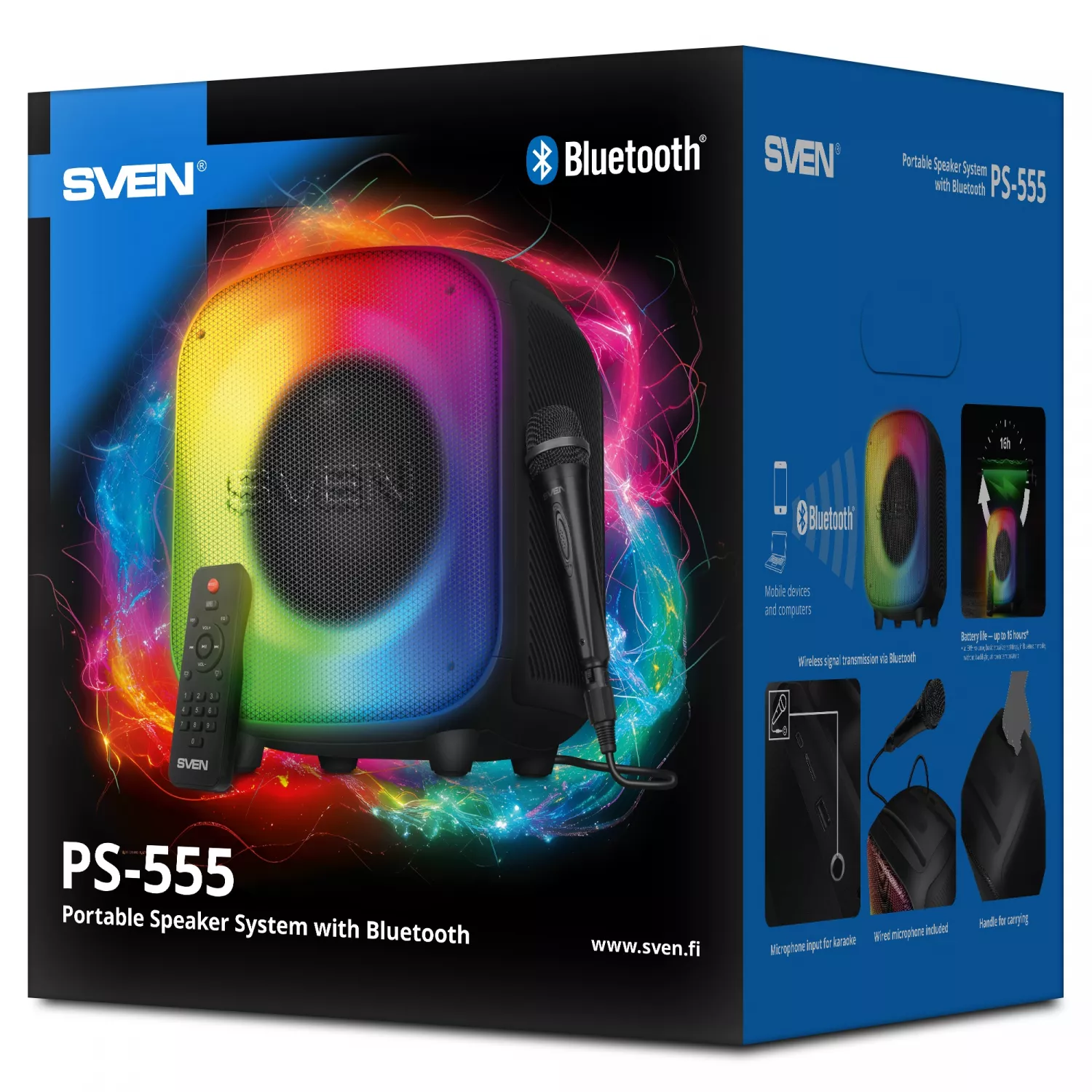 SVEN PS-555 Black, Bluetooth Portable Speaker, 65W RMS, Dynamic switchable RGB backlight, LED display, TWS, USB & microSD, built-in lithium battery 4000 mAh, AUX stereo input, Wired microphone included, Remote control |