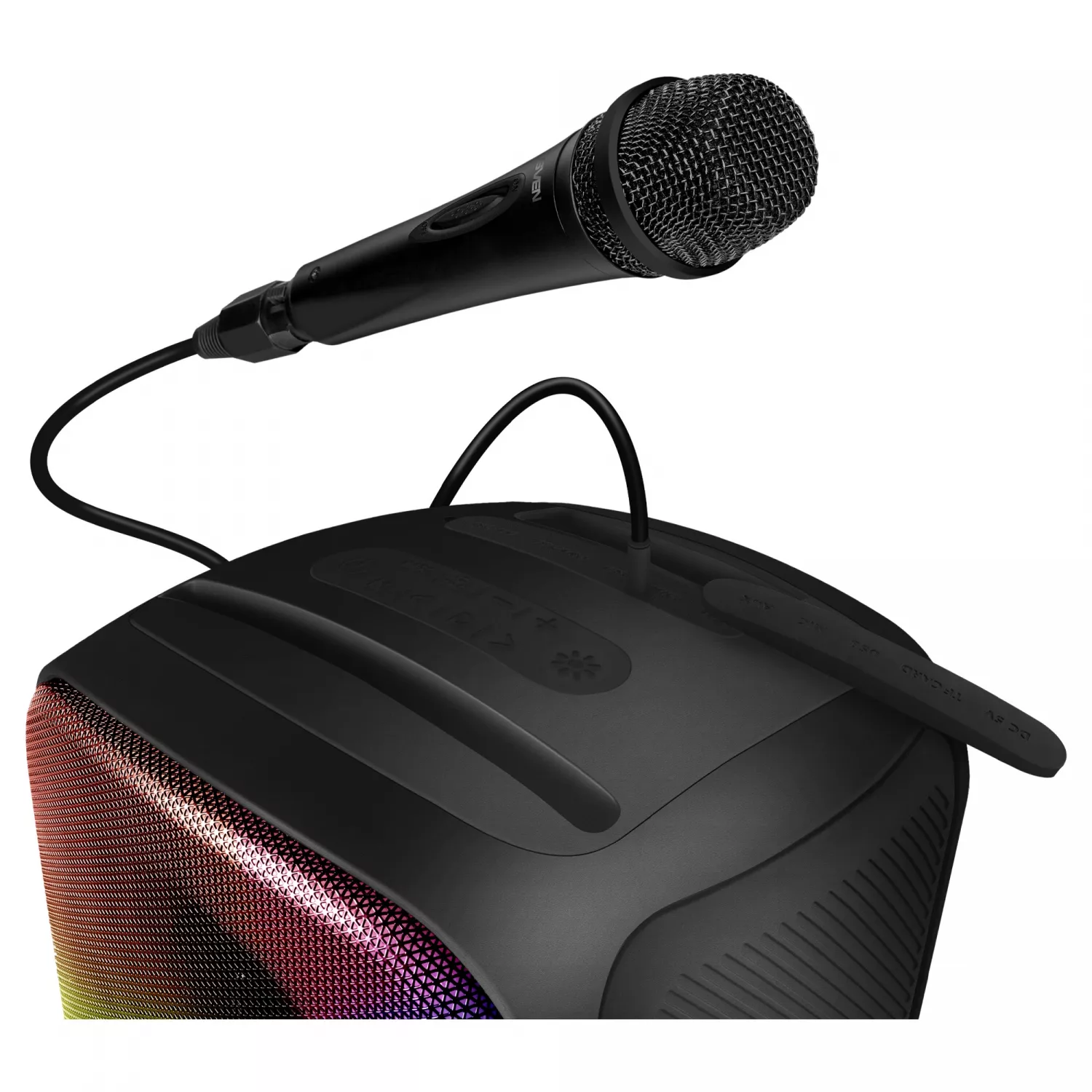 Boxa sven sven ps-555 black, bluetooth portable speaker, 65w rms, dynamic switchable rgb backlight, led display, tws, usb & microsd, built-in lithium battery 4000 mah, aux stereo input, wired microphone included, remote control