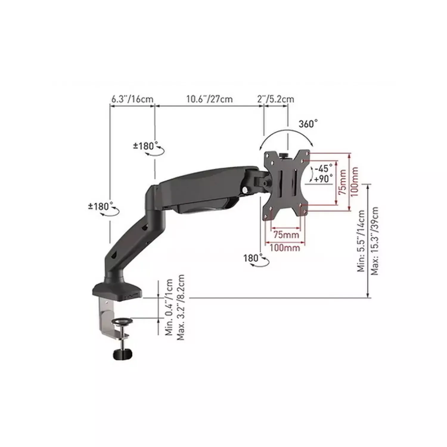 Suportul acceptă cinci tipuri de mișcare: reglarea înălțimii, rotația, plierea, pivotarea și înclinarea. Ecranul poate fi ridicat și coborât, rotit la 360°, pliat la 360°, rotit la 180° și setat la orientare portret sau peisaj. Înclinarea este reglabilă fără unelte de la -90° la 90°.