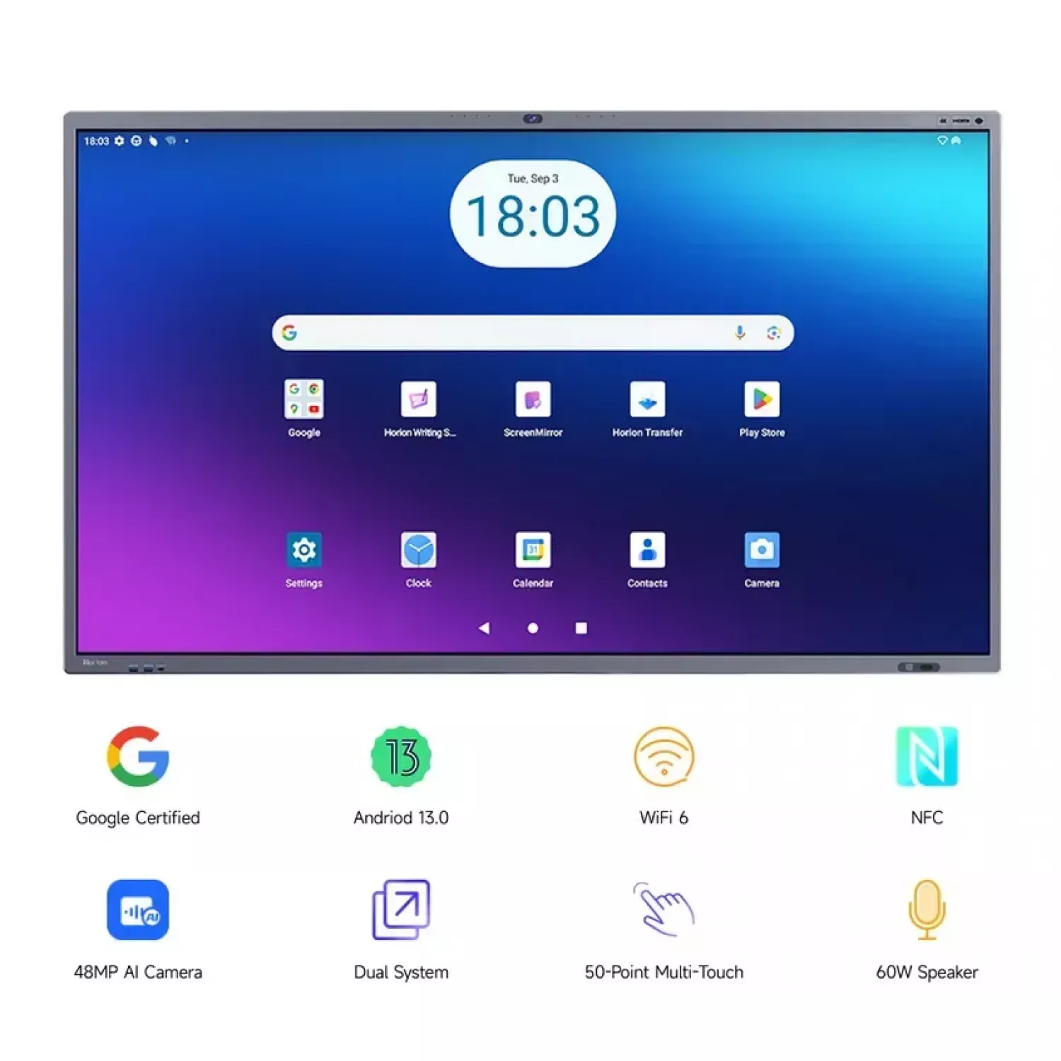 Interactive display horizon 75" interactive display horion 75m6apro edla, uhd 4k 3840x2160, 450 cd/m2, 1200:1, 50-points touch, cpu 8-core, android 13, 8gb ram + 128gb rom, 60w audio, wifi6, bt, 48mb camera, 8-array mic,2 pens+bracket, 2xhdmi,dp,2xlan,2xusb,type-c, 3xtouch usb
