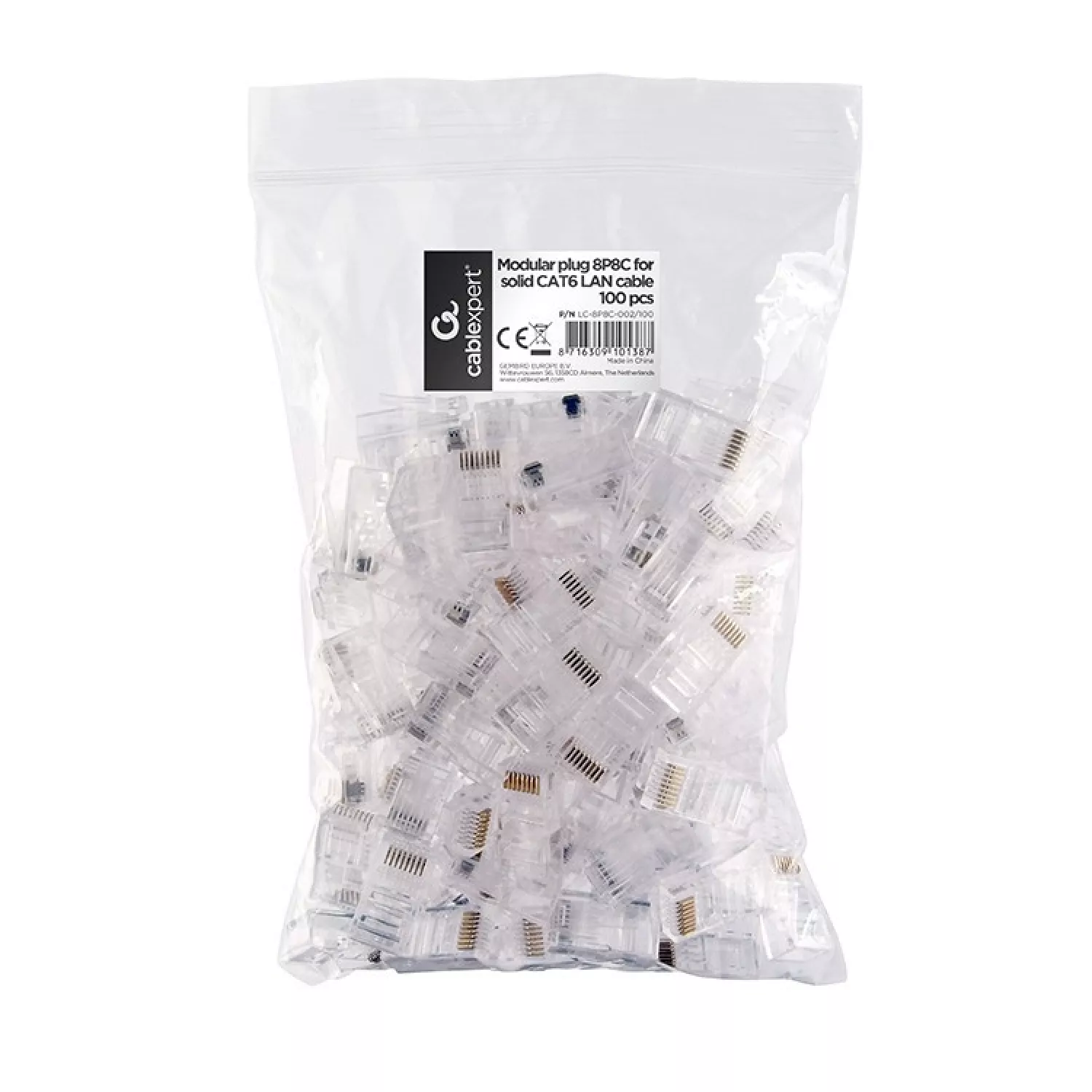 RJ45 Modular Plug LC-8P8C-002/100, Modular plug 8P8C for solid CAT6 LAN cable, 30u” gold plated, 100 pcs/bag