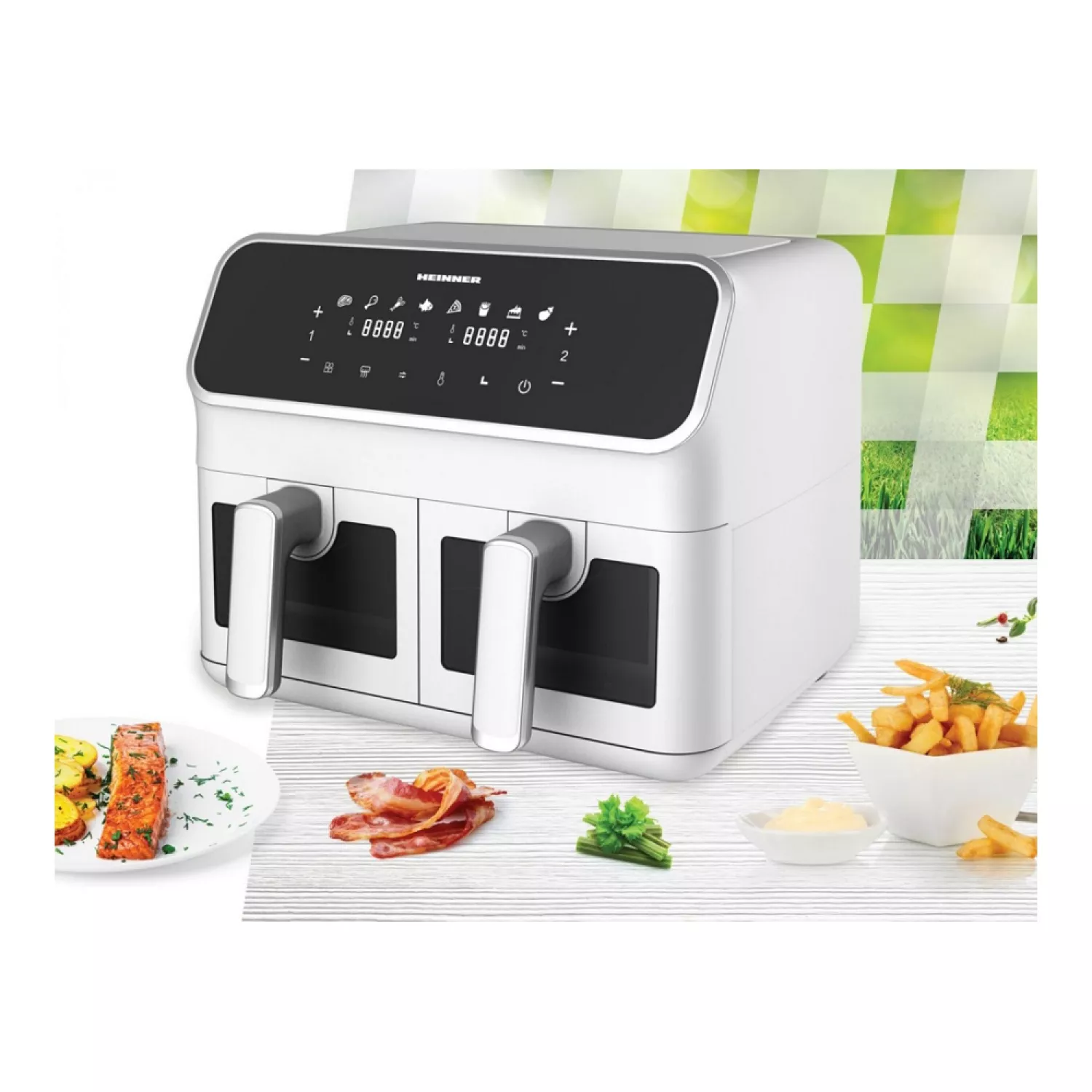 Аэрогрили Heinner HAF-H8DB17WH 1700 Вт | 8 л | Двоиная ( 4 л + 4 л) | Дисплей | Сенсорное управление | Окна наблюдения Белый