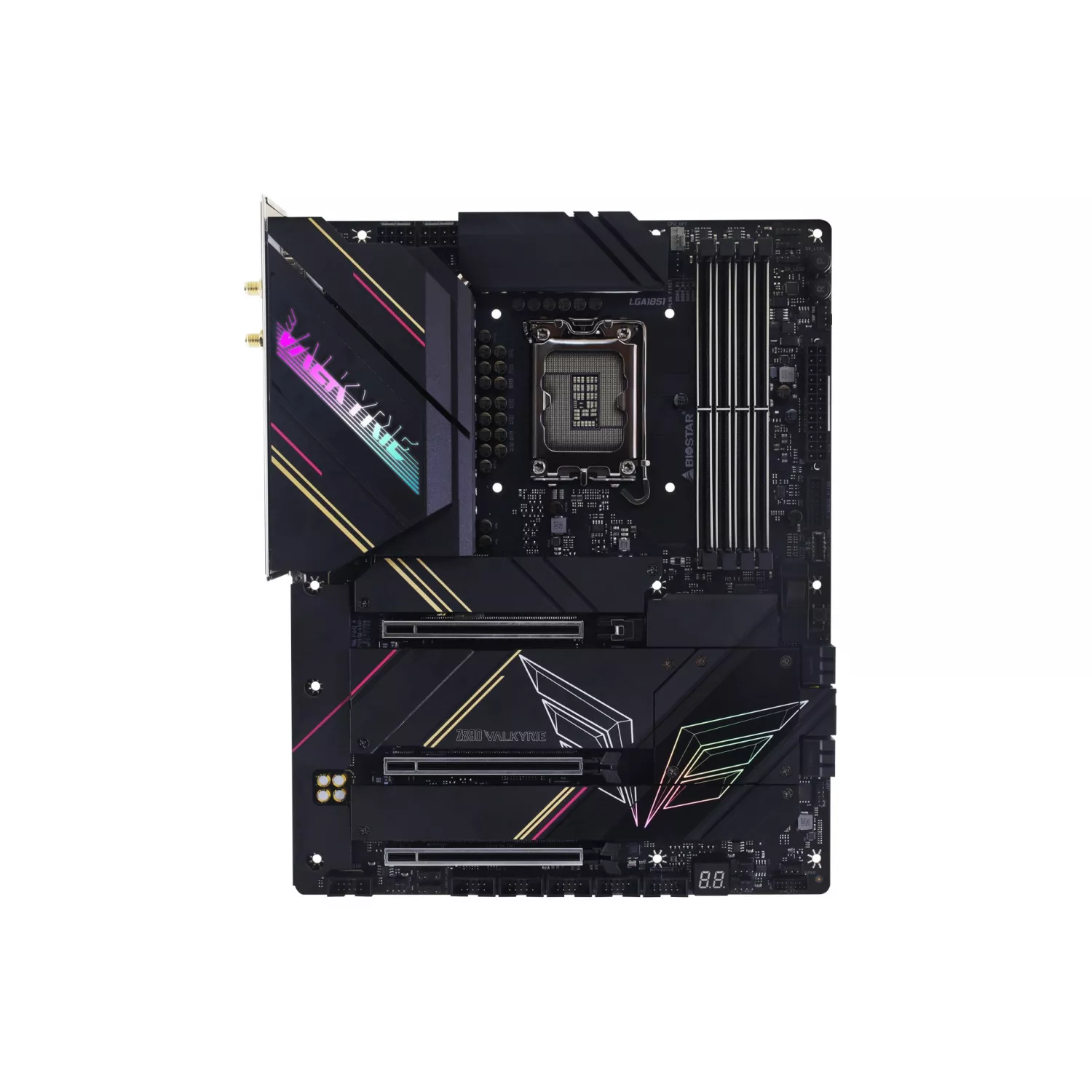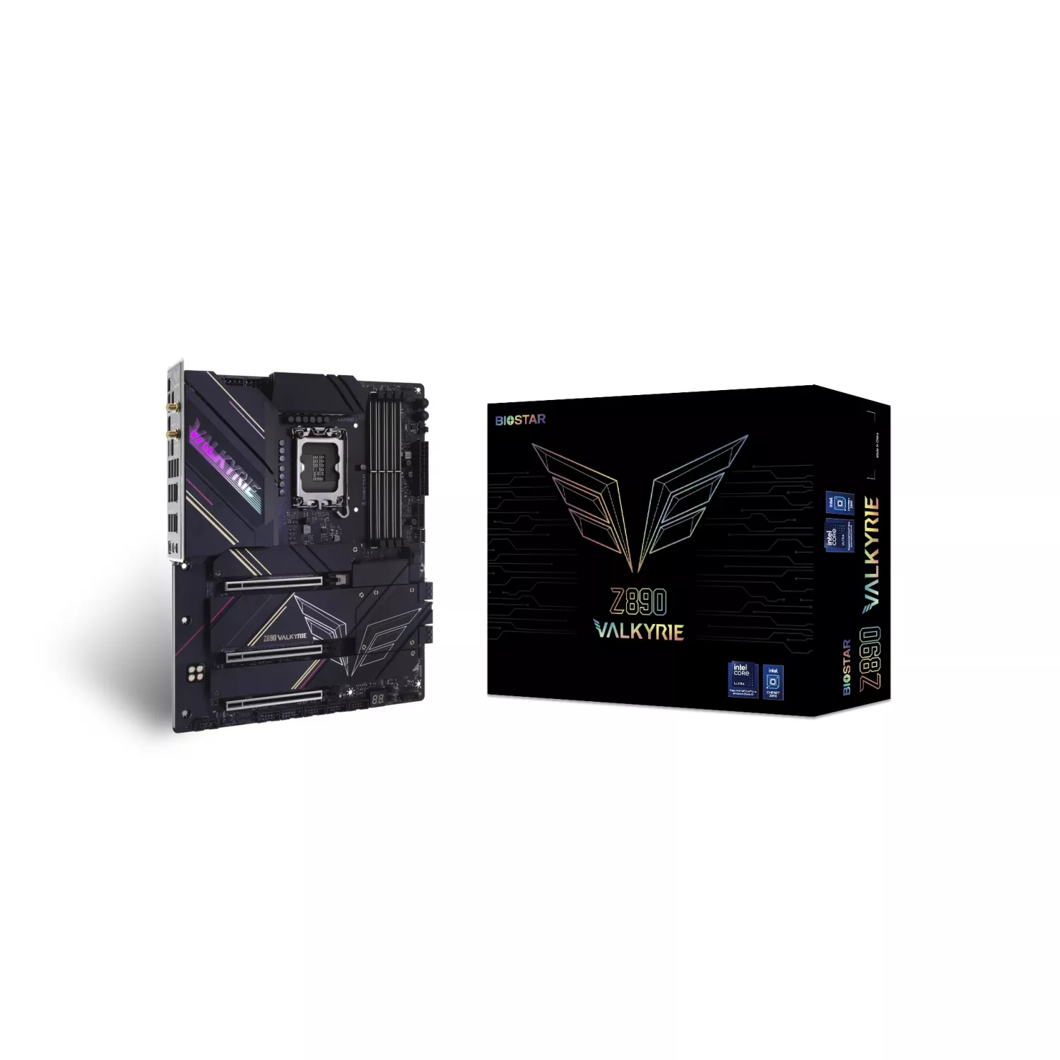 BIOSTAR Z890 VALKYRIE, Socket 1851, 22Phases, Intel® Z890 (Ultra 2 Series CPU), CPU graphics, 2xHDMI, DP, Dual 4xDDR5-9066, 3xPCIe X16 5.0, 4xSATA3, RAID, 6xM.2 5.0, 1xWiFi M.2 Key E, ALC1220, 1x5GbE, 2.5GbE LAN, 1xUSB-C4.0, 1xUSB-C 3.2Gen2x2, 11xUSB |