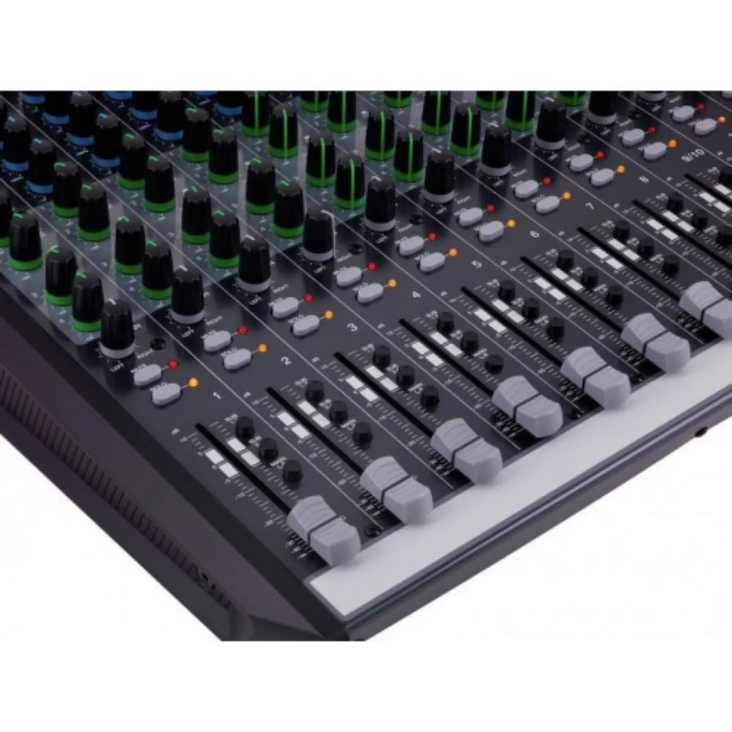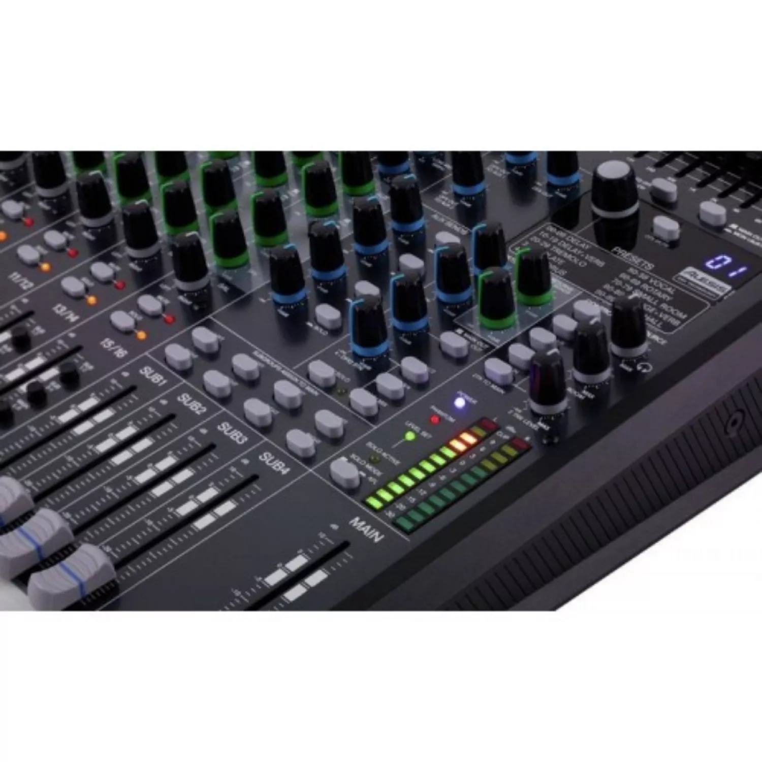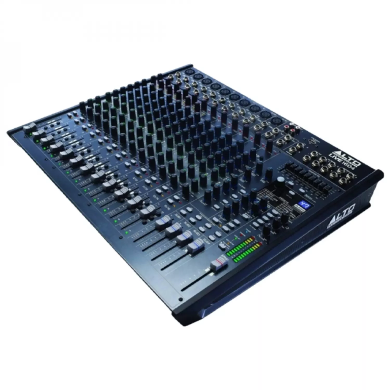 | 4 subgrupe; 10 canale de microfon; compresor dinamic pe canalele 1 – 6; canalele 9/10, 11/12 se poate folosi ca și canal mono sau stereo; EQ pe 3 benzi pe fiecare canal; EQ grafic pe 9 benzi pe main; 4 x trimiteri auxiliare pe canalele mono; fadere performante de 60 mm; buton Pantom Power; interfață audio prin USB; procesor de efecte DSP Alesis cu 100 efecte; ieșiri principale XLR sau Jack; ieșire de căști cu control de volum. |
