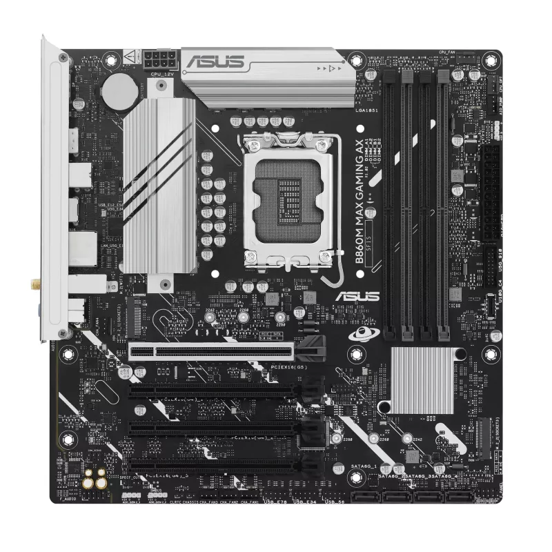 ASUS B860M MAX GAMING AX Intel B860, LGA1851, Dual DDR5 8666+ MHz, PCIe 5.0 x16, PCIe 4.0 x16, DP/USB Type-C video, Intel SATA RAID, M.2 PCIe 5.0 x4, 2xM.2 slots PCIe 4.0 x4, SB 8-Ch., Wi-Fi 6&BT5.4, 2.5Gb Ethernet