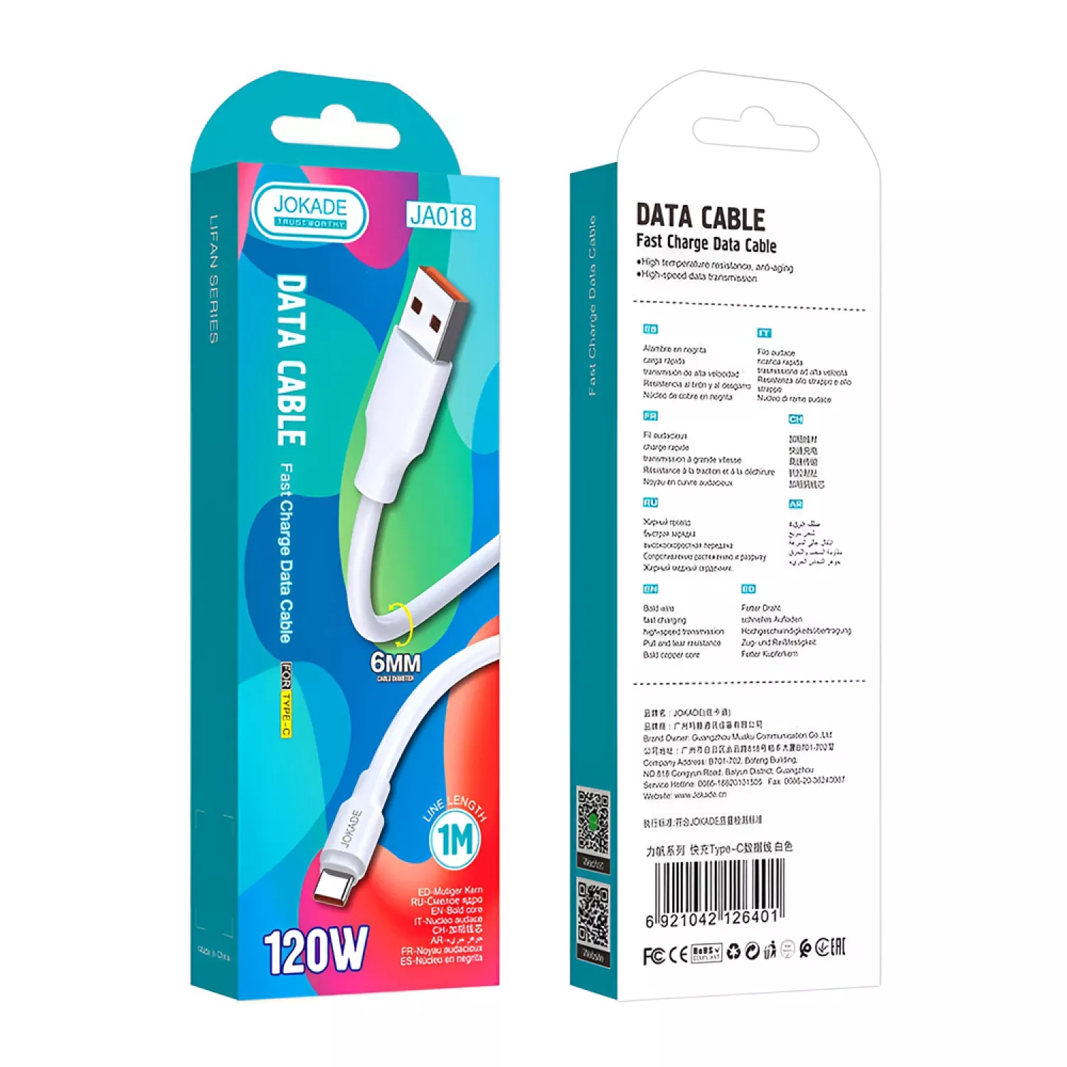 Cablu jokade jokade cable usb-a to type-c 120w 1m ja018, white