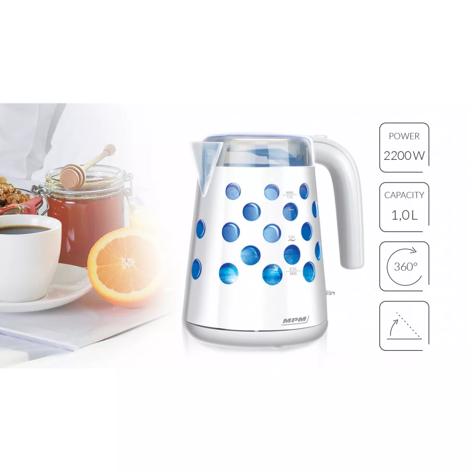 Ceainic electric mpm mcz-86, 1.7 l, 2200 w, plastic, sticla, alb