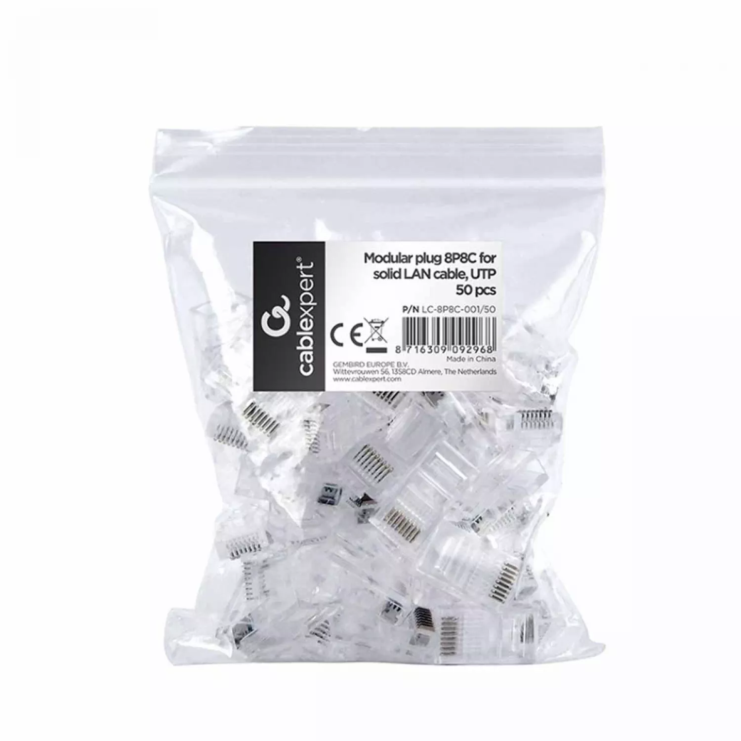 Conector rj45 gembird lc-8p8c-001/50, modular plug 8p8c for solid lan cable, 30u" gold plated, 50 pcs/bag