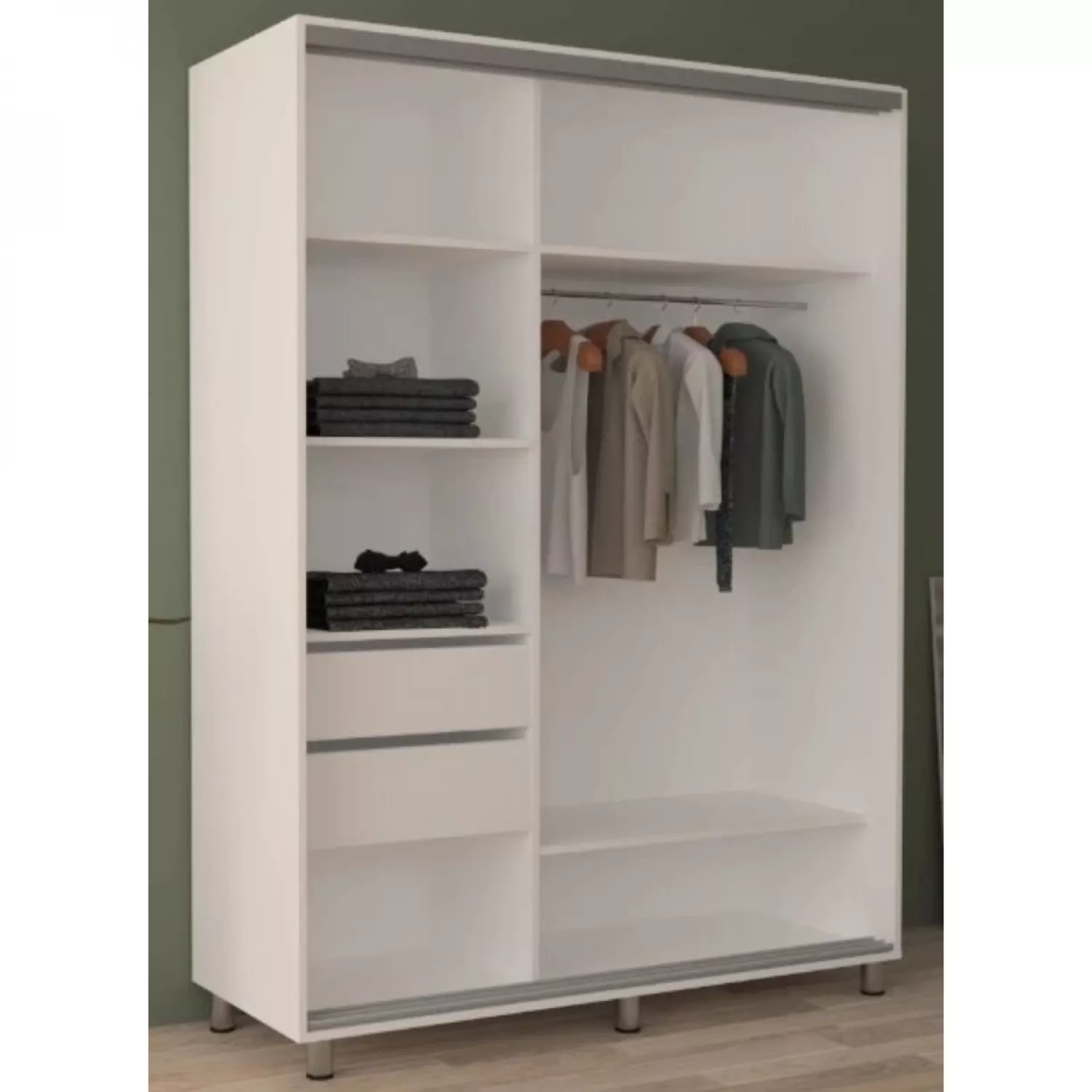 Сompartimentarea interioara este prevazută cu polițe și două sertare din partea stîngă și din partea dreapta, două polițe și bara pentru umerașe la mijloc