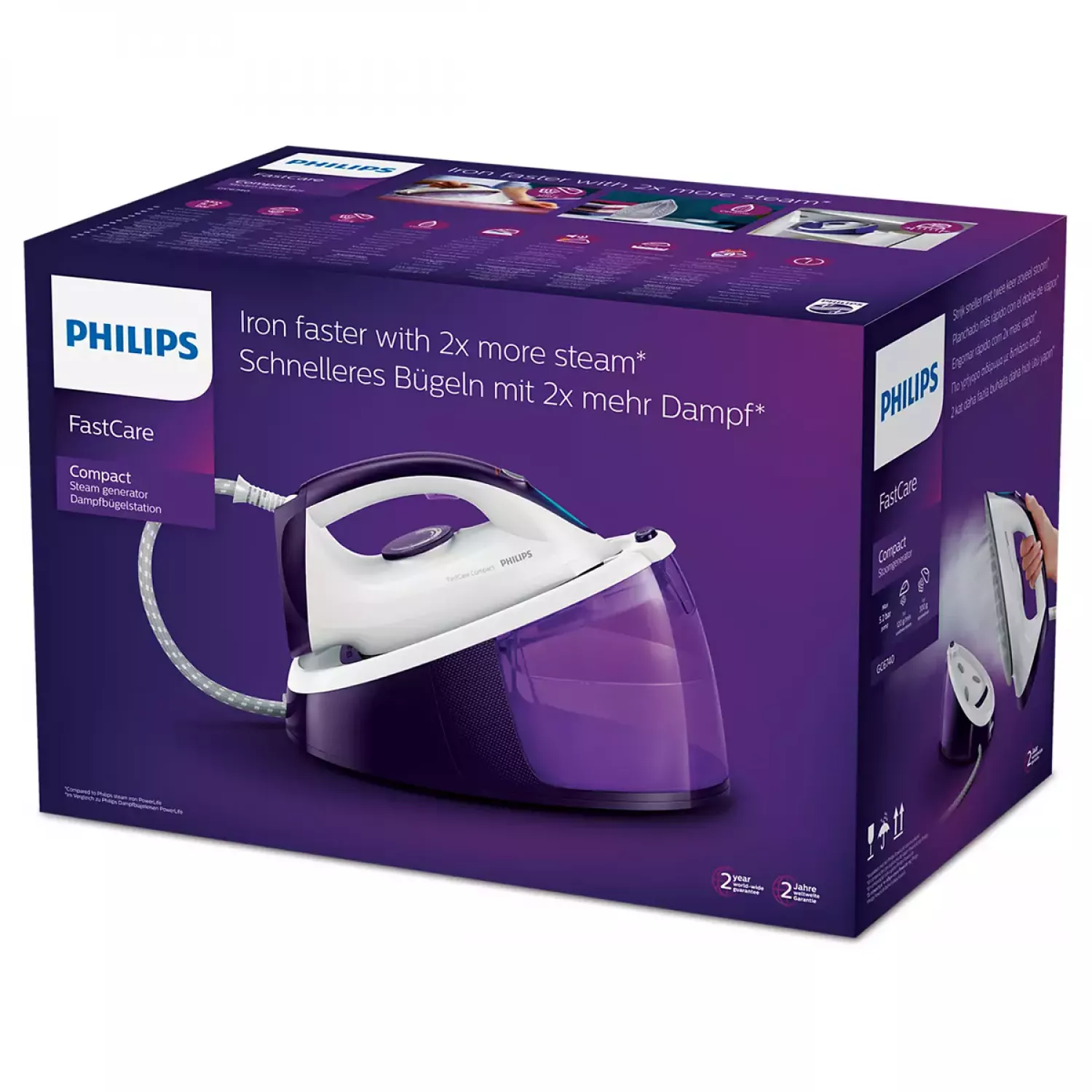 Caracteristici pentru Fier de calcat PHILIPS GC674030, 2400 W, 300 g/ min, 1500 ml, Talpa ceramica, Violet, Alb