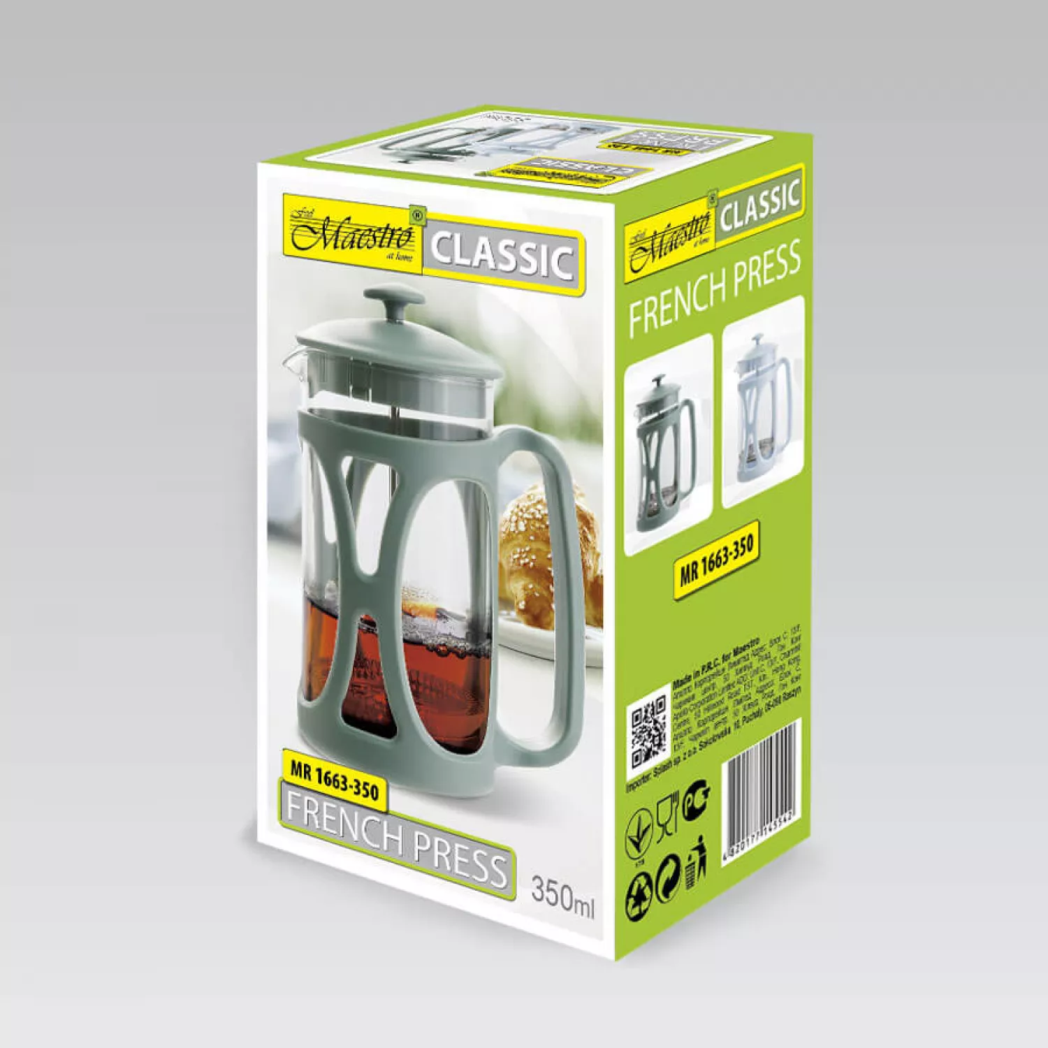 Caracteristici pentru French-press Maestro MR-1663-350, 350 l, Plastic, Sticla termorezistenta, Verde, Portocaliu, Rosu
