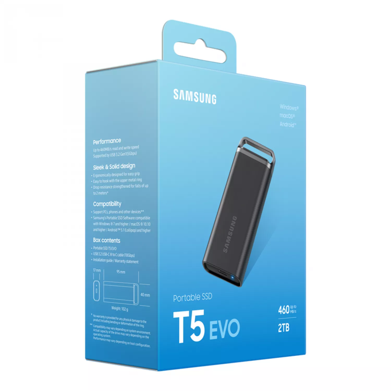 Caracteristici pentru Hard disk extern Samsung 2.0TB PORTABLE SSD T5 EVO BLACK, USB-C 3.0 (95X40X17MM, 102G, R/W:460/460MB/S)