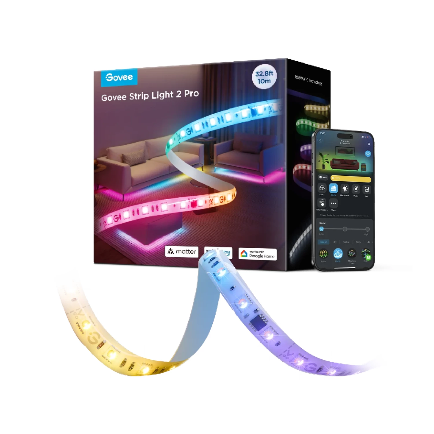 LIGHT STRIP RGBICWW LED STRIP LIGHT 2 PRO 5M, PROTECTIVE COATING, SMART WI-FI LIGHT STRIP, 5-IN-1 RGBIC+ TECHNOLOGY, MATTER COMPATIBLE, MULTICOLOR, ZONAL COLOR CONTROL, APP, VOICE CONTROL, NO HUB REQUIRED, 3M PEEL-AND-STICK, FLEXIBLE INSTALLATI |