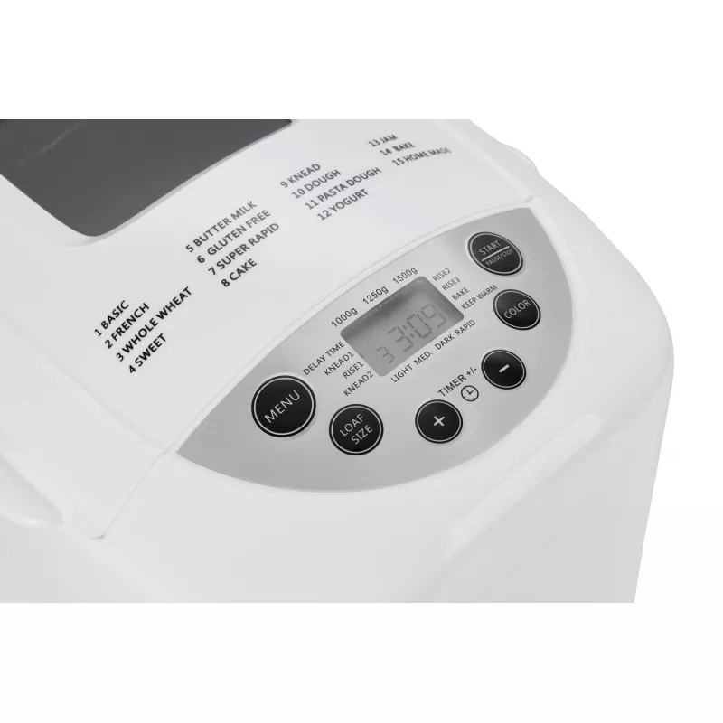 Numeroasele facilități fac din utilizarea acestui aparat o plăcere! Puteți alege dimensiunea pâinii (de la 1000 la 1500 g) și culoarea crustei, sau gradul de rumenire. În interior, există o tavă detașabilă acoperită cu un strat care facilitează scoaterea pâinii coapte. Caracteristicile suplimentare, cum ar fi funcția de menținere la cald sau pornirea întârziată, vă permit să monitorizați procesul de coacere. Capacul are o fereastră prin care puteți monitoriza procesul de coacere. În plus, aparatul dispune de un afișaj LCD și butoane ușor accesibile, ceea ce face ca operarea să fie cu adevărat intuitivă!