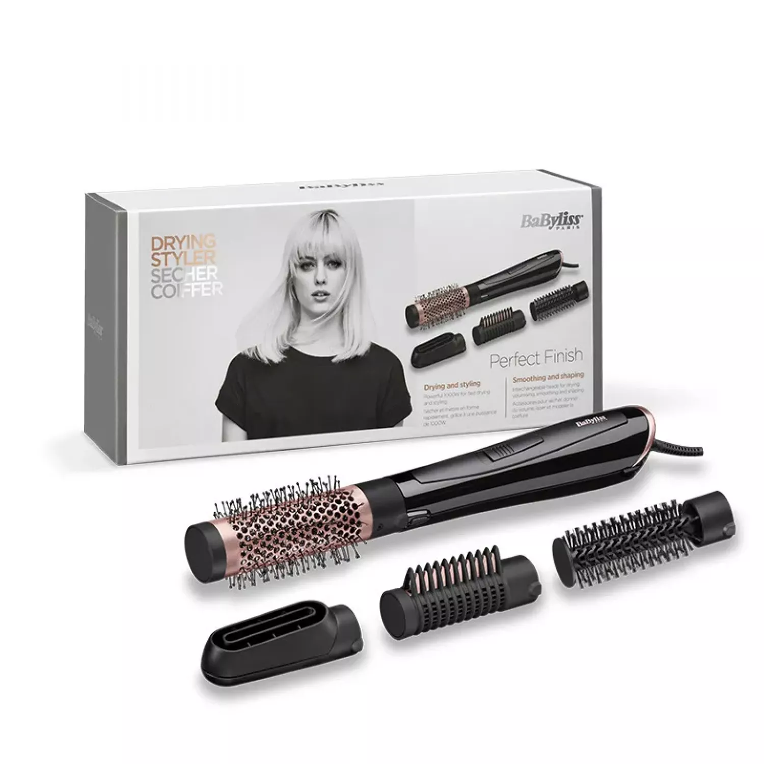 Caracteristici pentru Perie cu aer BABYLISS AS126E, 1000 W, 2 trepte de viteza, 2 regimuri de temperatura, 4 duze, Functie ionica, Negru
