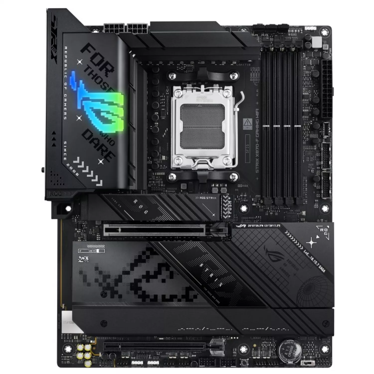 ASUS ROG STRIX X870-F GAMING WIFI, Socket AM5, AMD X870, 20Phases, Dual 4xDDR5-8000+, APU AMD graphics, HDMI, DP, 2xPCIe 5.0 X16, 2xSATA3, RAID, 4xM.2 PCIe 5.0, 1xPCIe x4, ALC 4080 HDA, 2.5GbE LAN, WiFi7/BT, 2xUSB4(Type-C), 1xUSB-C2x2, 6xUSB3.2 Gen2(