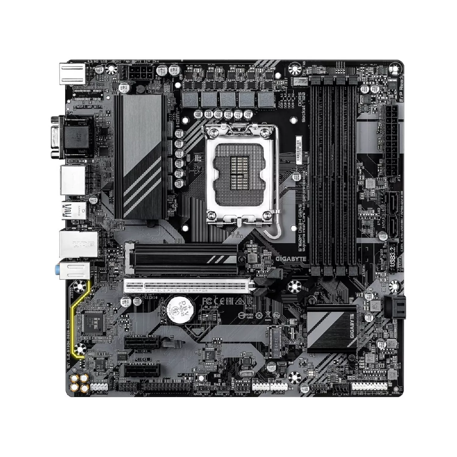 GIGABYTE B760M DS3H GEN5, Socket 1700, Intel® B760 (14/13/12th Gen CPU), 9Phases, CPU iGPU, Dual 4xDDR5-7600, VGA, HDMI, 2xDP, 1xPCIe X16 5.0, 4xSATA3, RAID, 2xM.2 4.0, 2xPCIe X1, ALC897 HDA 7.1, 1x2.5GbE LAN, 1xUSB-C 3.2 Gen2, 5xUSB 3.2, RGB Fusion