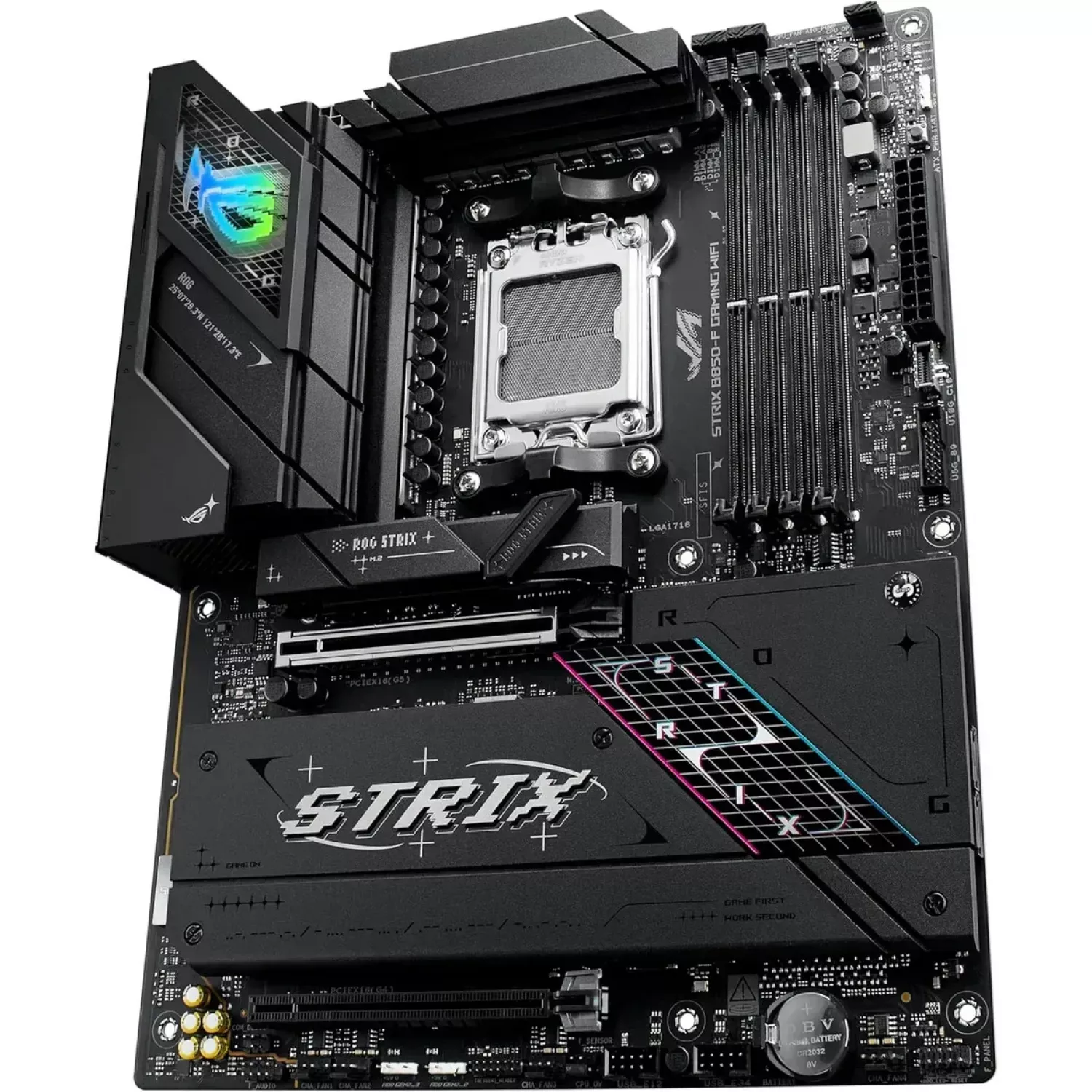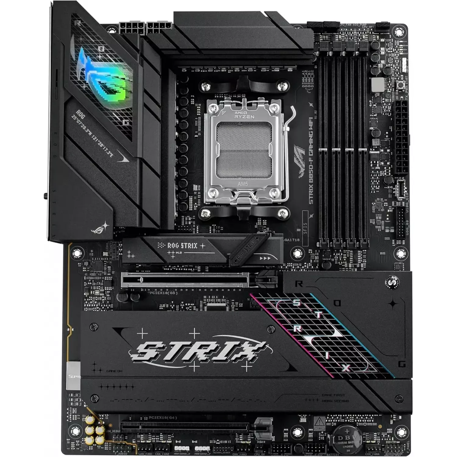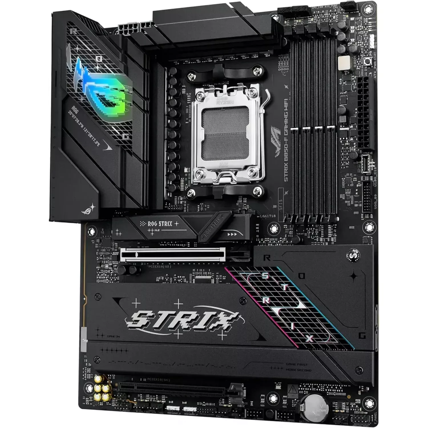 ASUS ROG STRIX B850-F GAMING WIFI AMD B850, AM5, Dual DDR5 8000+MHz, 2xPCIe 5.0 x16 slot, HDMI/DisplayPort, USB Type-C, SATA&PCIe RAID, 2xM.2 PCIe 5.0 x4, M.2 PCIe 4.0 x4, Wi-Fi 7 802.11be&BT 5,4, 2.5Gb Ethernet, Aura (placa de baza/материнская плата