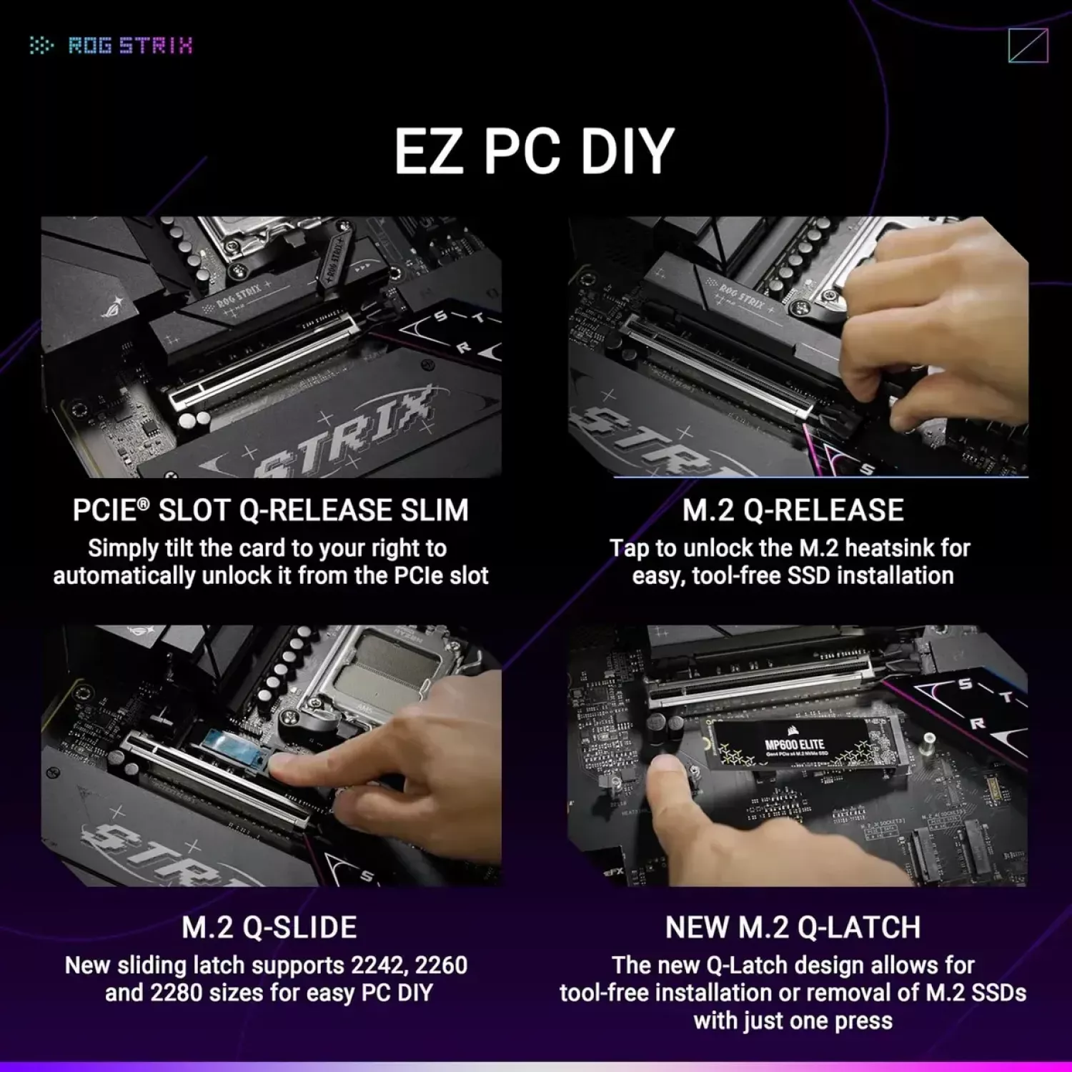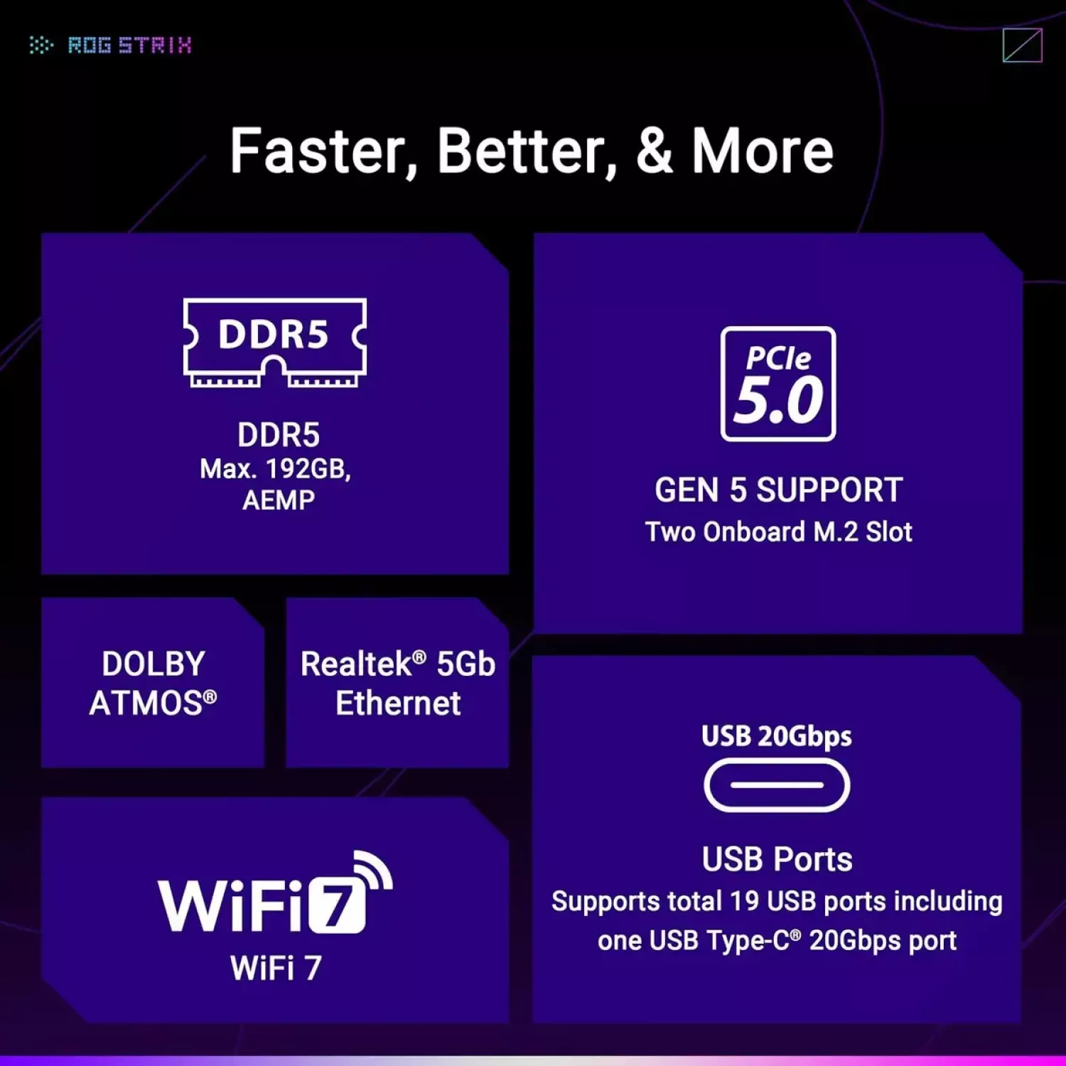 Caracteristici pentru Placa de baza MSI ASUS ROG STRIX B850-F GAMING WIFI AMD B850, AM5, Dual DDR5 8000+MHz, 2xPCIe 5.0 x16 slot, HDMI/DisplayPort, USB Type-C, SATA&PCIe RAID, 2xM.2 PCIe 5.0 x4, M.2 PCIe 4.0 x4, Wi-Fi 7 802.11be&BT 5,4, 2.5Gb Ethernet, Aura (placa de baza/материнская плата