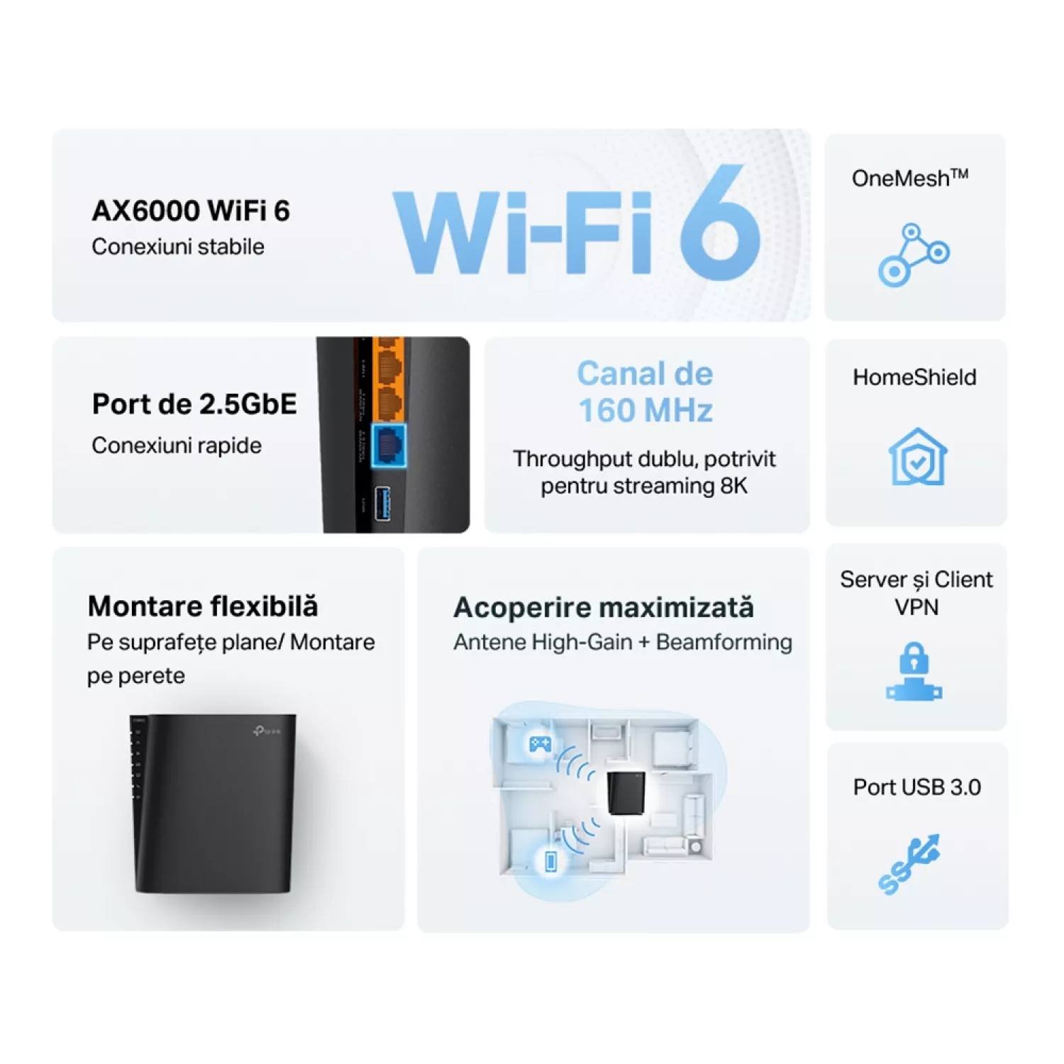Caracteristici pentru Router wireless TP-LINK Wi-Fi 6 Dual Band Router "Archer AX80", 6000Mbps, OFDMA, MU-MIMO,1x2.5Gbit LAN/WAN, USB3.0