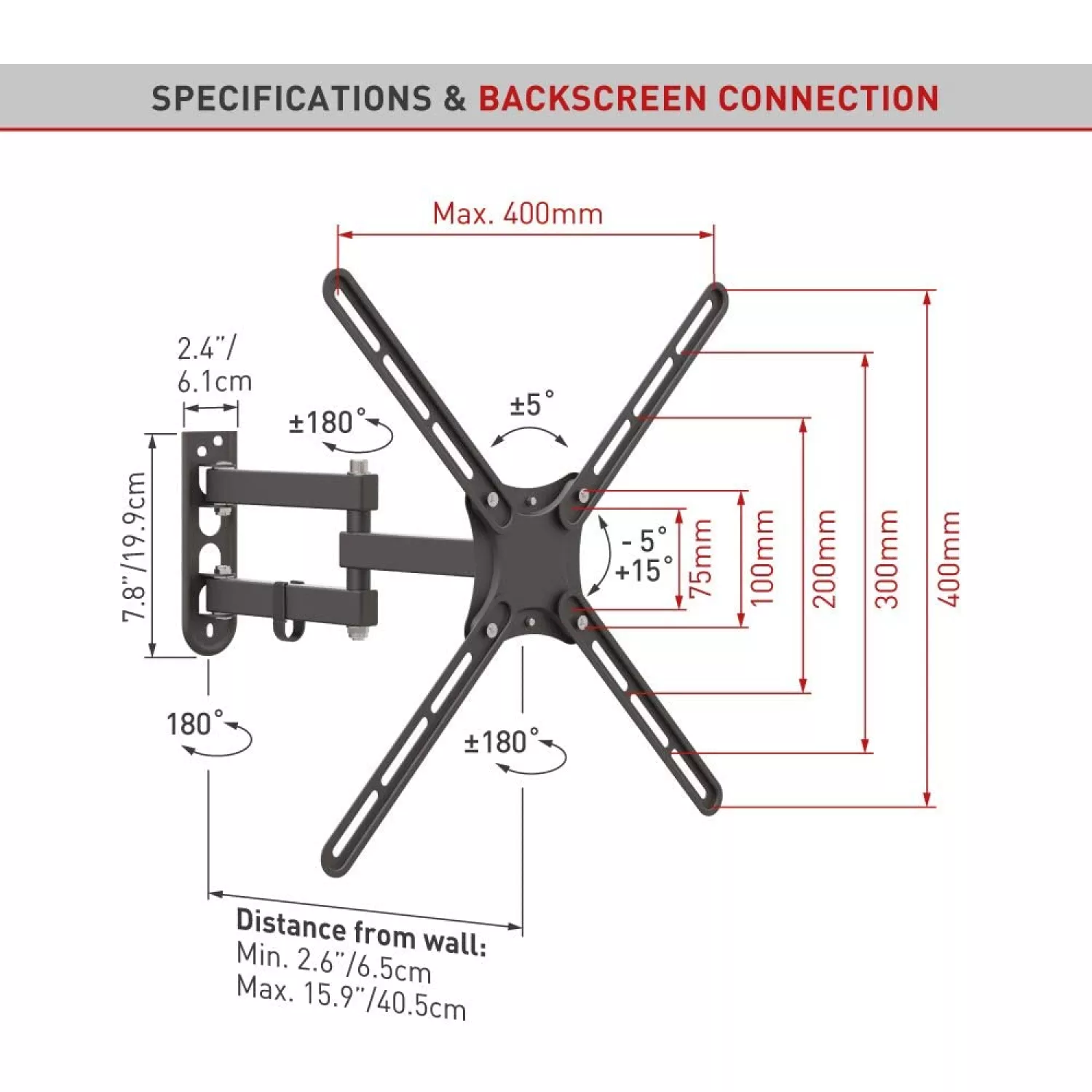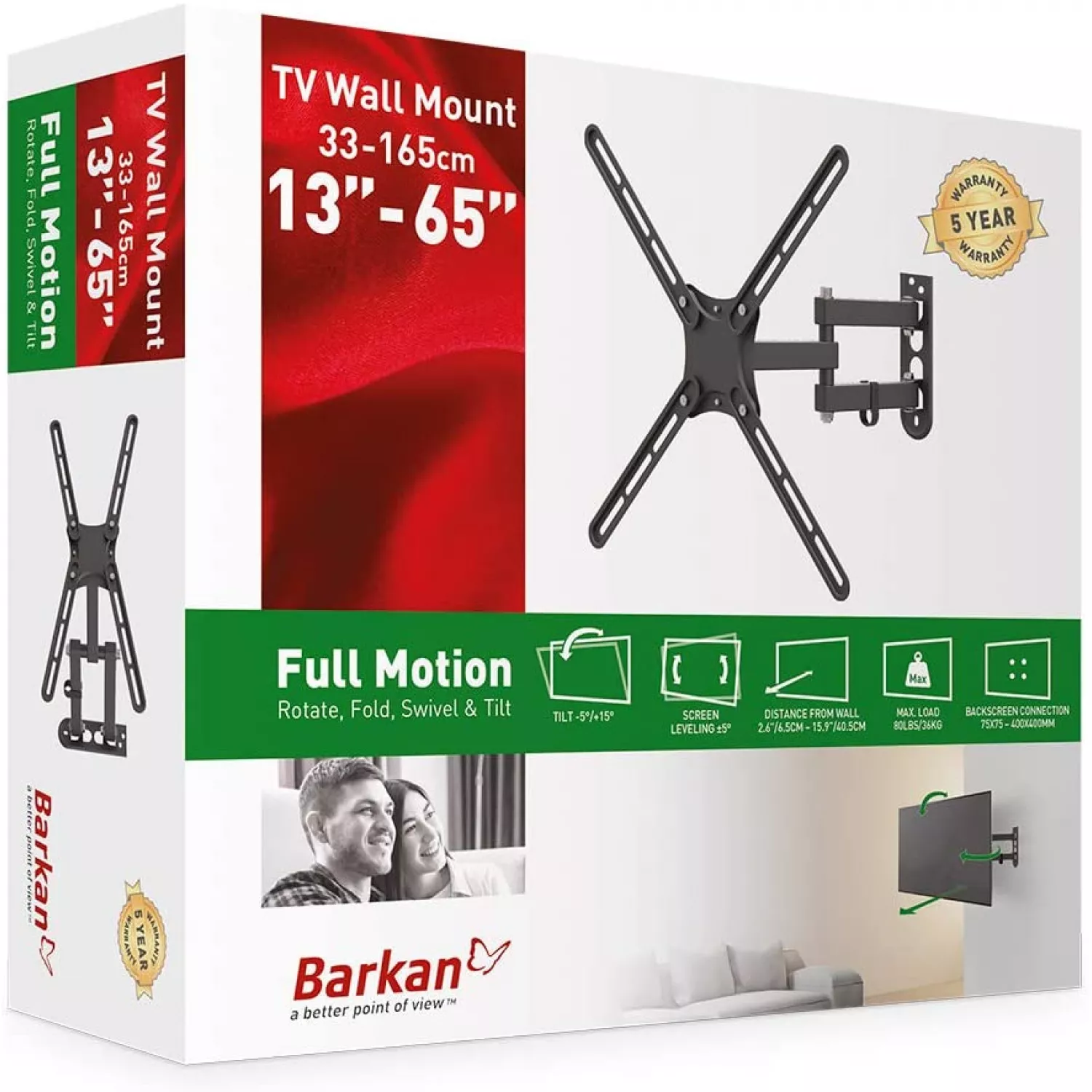 Характеристики для Настенное крепление BARKAN E3433, 13"-65", -5°, +15°, 400x400, 36.2 кг, Чёрный