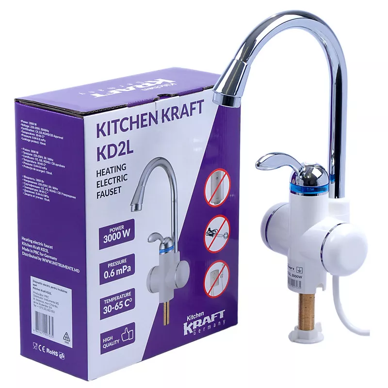 Характеристики для Электрический проточный водонагреватель Kitchen Kraft KD2L, Проточный, 2 кВт, 230, 50 В, Гц, 30-65°С, Вертикальная установка